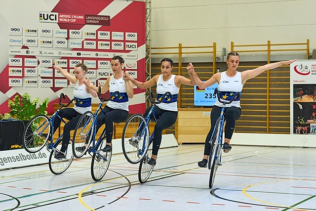 „Sie sind Teil eines Jahrhundertereignisses“, sagte SWR-Moderator Christian Döring, der durch den Festakt führte. „Denn genau vor 100 Jahren im Sommer 1925 fanden sich 25 Männer zusammen, um den Verein zu gründen.“ Heute hat der Verein mehr als 250 Mitglieder. Zeitzeugen wie der Ehrenvorsitzende Friedel Worf und Willi Becker kamen zu Wort und erzählten so manche Anekdote. „Es läuft rund“, betonte Ortsvorsteherin Anette Odenweller. „Mit Katrin und Sandra ist der Spitzensport in Ebersheim angekommen.“ Gemeint sind Katrin Schultheis und Sandra Sprinkmeier, die früheren Weltmeisterinnen im Zweier-Kunstradfahren. Aktuelles Aushängeschild des RVE ist der Kunstrad-Vierer mit Annika und Stella Rosenbach, Tijem Karatas, Milena Schwarz, Svenja Kraus und Trainer Oliver Schwarz, der Europameister, Weltmeister und zweimal Vizeweltmeister wurde. Unter großem Beifall der Gäste zogen die einzelnen Abteilungen Badminton, Radraketen, Rennrad, Radball und Kunstrad beim Festakt nach und nach in die Töngeshalle ein und stellten sich vor.