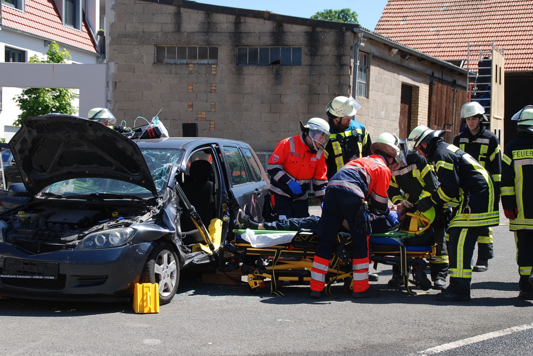 Der Parkplatz am Ende der Grauelstraße war für die Schauübungen abgesperrt. Mit dem Ebersheimer Drehleiterfahrzeug wurde eine Person über einen Balkon aus einem vermeintlich brennenden Appartement gerettet, ein bei einem Verkehrsunfall eingeklemmter Mann musste mit Rettungsscheren aus seinem Auto geschnitten werden. Niko Meurer, Moderator der Übungen und Mitglied der aktiven Einsatzmannschaft, und Wehrführer Nolte erklärten, die Menschen sollen hautnah miterleben, worum es bei der Feuerwehrarbeit geht, wie sie mit verschiedenen Einsatztruppen der Polizei, der Rettungssanitäter oder auch der Hundestaffel der Malteser Hechtsheim Hand in Hand zusammenarbeiten.