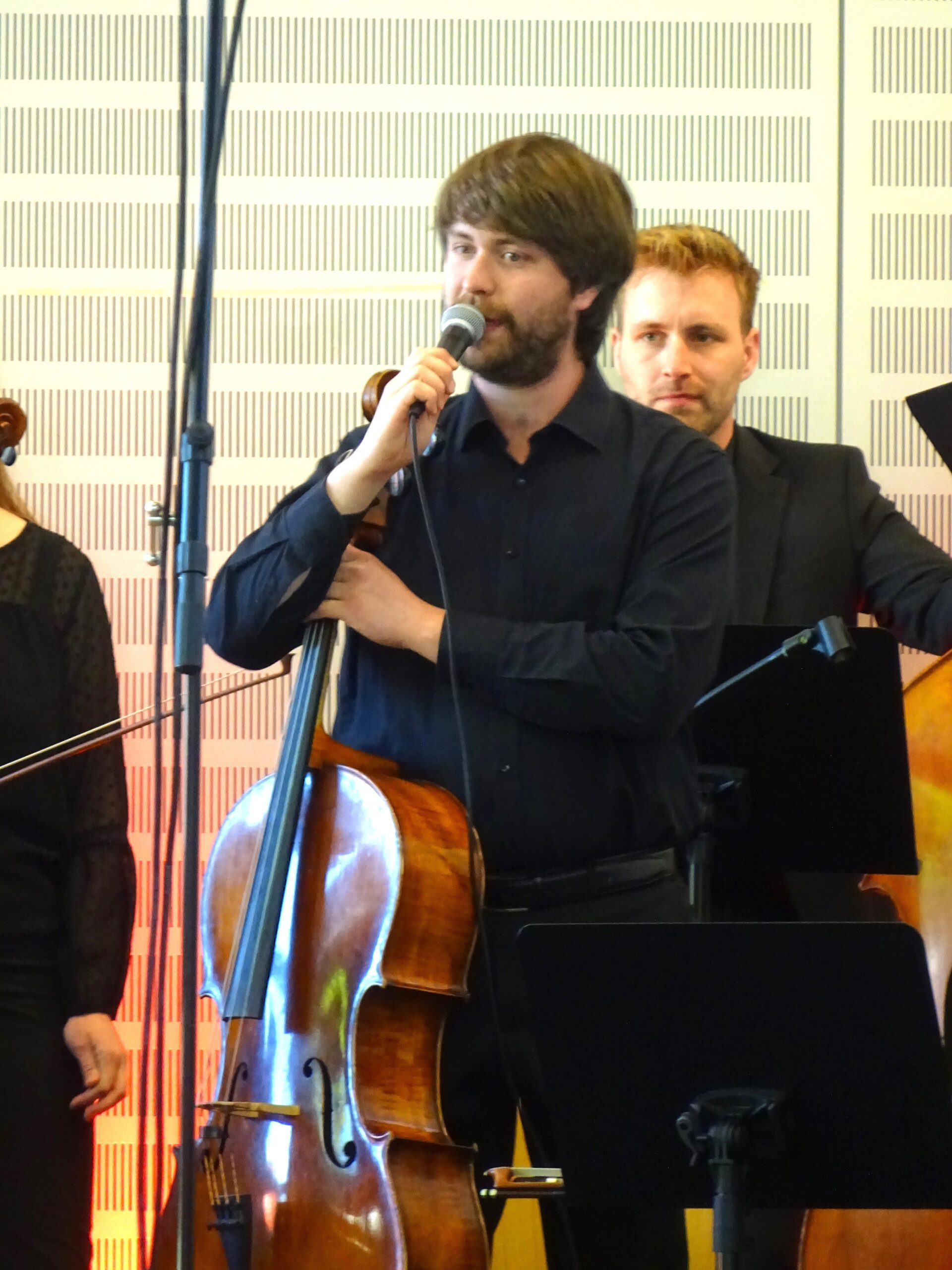 Das Konzert startete leicht und schwungvoll mit dem ersten Teil „Indi Mindi“ der „Neun Miniaturen für Streichorchester“ des Georgiers Sulchan Zinzadse (1925-1991). „Herzlich willkommen an diesem schönen Sonntagnachmittag“, sagte Johannes Christ zu Beginn. „20 Jahre KAMEL, damals waren wir noch ein bisschen kleiner, da waren wir noch in der Grundschule“, so Johannes Christ weiter. „Los ging’s damals mit ,My Bonnie is over the Ocean’, das spielen wir heute nicht!“