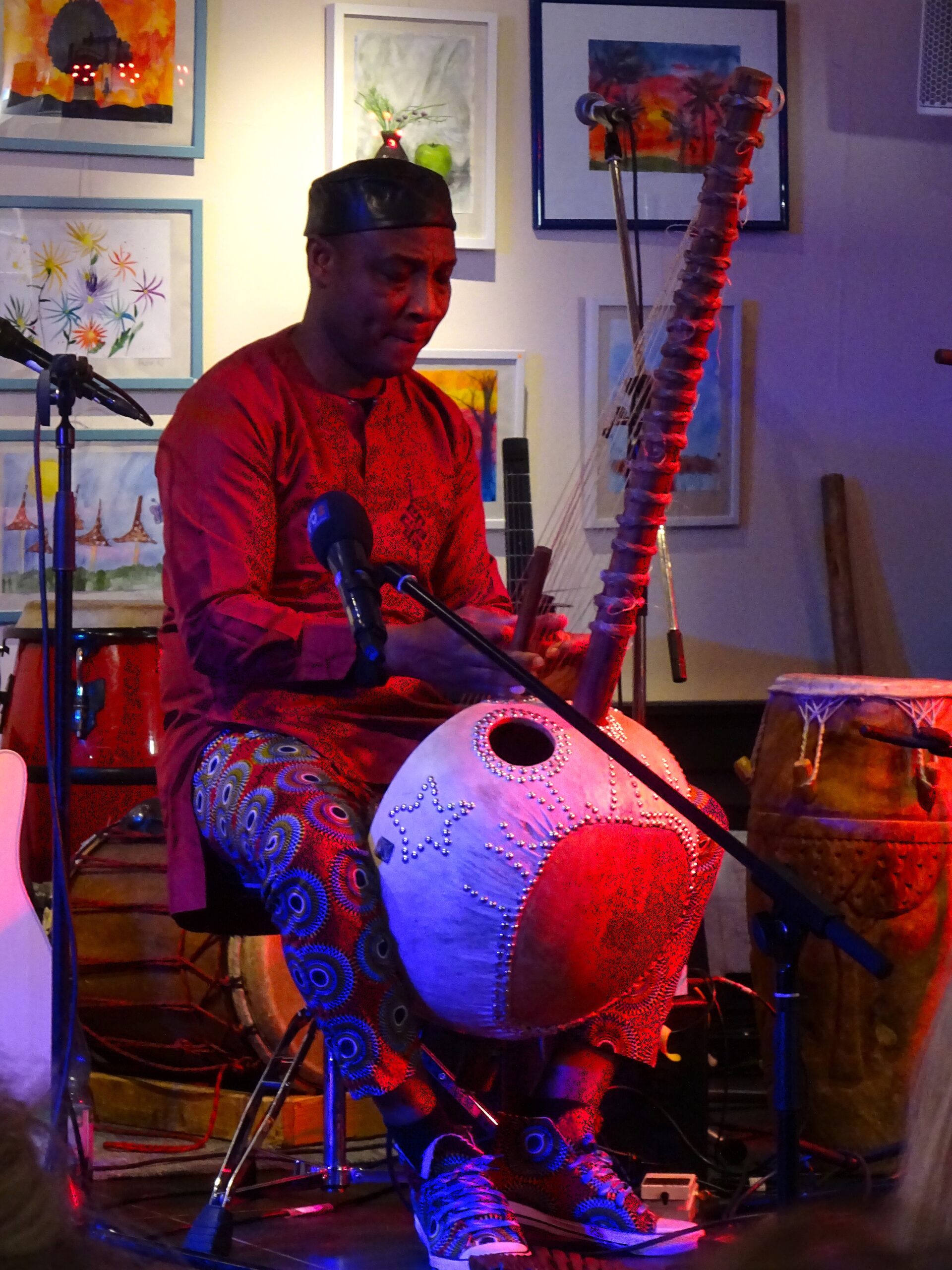 Zwischendurch stellt der Musiker einige seiner Instrumente vor. Etwa die Kora, eine afrikanische Stegharfe mit 21 Saiten, die zweihändig mit vier Fingern – jeweils Daumen und Zeigefinger – gespielt werde. Virtuos musiziert der Künstler auf seinem Instrument, regt zum Mittanzen an und macht beim Stück „Savannah Swing“ zwischendurch Witze: Die Saiten könne man auch als Angelschnüre verwenden: „Wenn ich keine Lust mehr auf das Instrument habe, nehme ich eine Saite und gehe Fischen!“