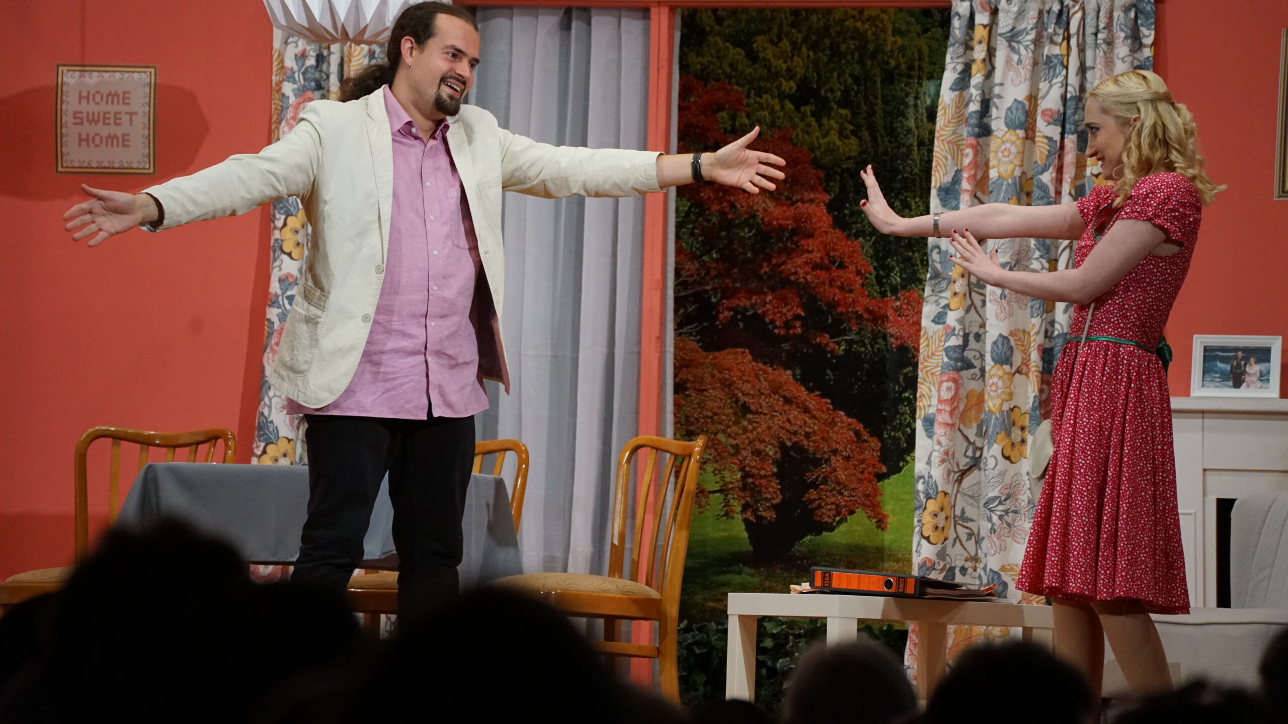Die britische Komödie „Ausgerechnet Du!“ von Derek Benfield wurde von Regisseur Uwe Greiner zusammen mit Karoline und Benedict Totsche überarbeitet – lokale Bezüge zum Stadtteil Finthen kamen dabei nicht zu kurz. So wurde etwa abseits des Drehbuches die Rolle des Vorsitzenden des örtlichen Gartenbauvereins, James Green (Martin Rudolph), entwickelt, der bereits zu Aufführungsbeginn den Humor des Publikums traf.