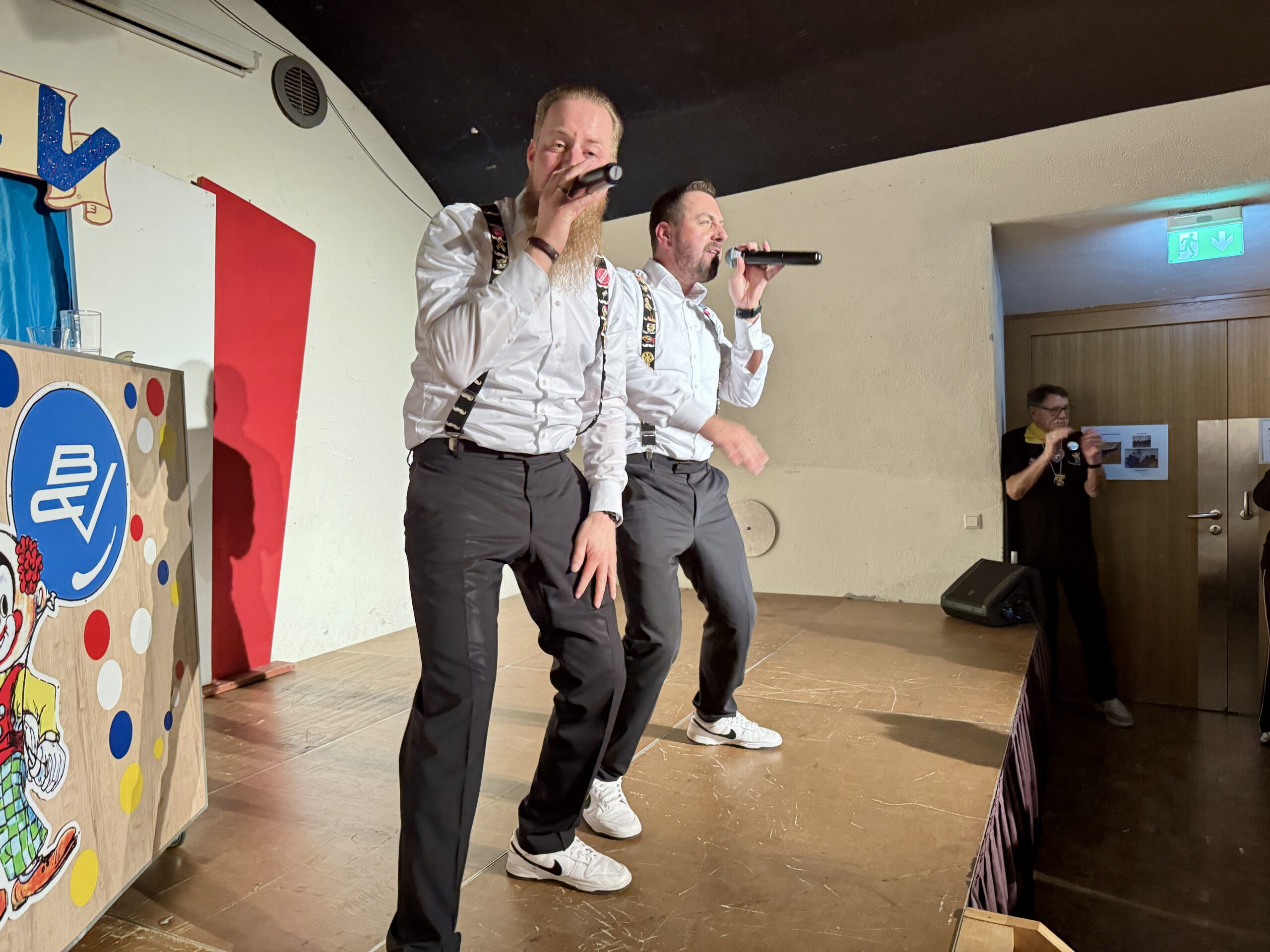 Das Duo DobbelBock, bekannt aus Funk und Fernsehen, laut Dietz „die nettesten Fastnachter von Meenz“, weil „so normal und gar nicht überheblich“, luden daraufhin zum Mitsingen und Schunkeln ein. Und aus dem hessischen Bürstadt kam Barbie 2.0 vorbei, Manuela Hartmann-Keil, seit Jahren Sitzungspräsidentin der HR-Weiberfastnacht. Auf Jobsuche nach einem erfolglosen Hollywood-Abenteuer entschied sie sich schließlich für „Hüttenwirtin im Schwarzwald“ und sang mit dem Publikum ihr: „Rosa Traum – Barbie von de Hütt“ – authentisch, herzlich und mitreißend. Ein lang erwarteter Höhepunkt folgte auf geballte Frauenpower: die Specktorpedos, das Männerballett des BCV, als Handwerker für alle Fälle. Hochenergetisch, sportlich und ganz ohne Speck, wie man unschwer und anerkennend feststellen konnte. Moderatorin Kathrin versprach, die Telefonnummern der Handwerker später im Publikum zu verteilen.