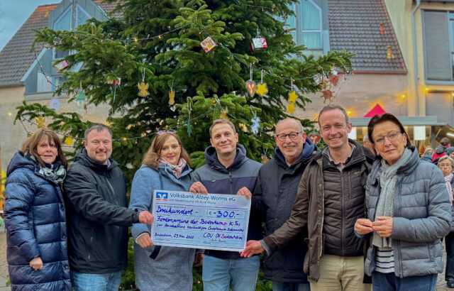 BODENHEIM – Vom Nikolausmarkt in Bodenheim erreichte die Redaktion eine schöne adventliche Nachricht: Die Kitas der Gemeinde werden sich demnächst über nachhaltigen Weihnachtsbaumschmuck freuen können. Das soll eine Spende aus den Erlösen des diesjährigen Martinsmarktes in Bodenheim ermöglichen, die anlässlich des Nikolausmarktes übergeben worden ist.