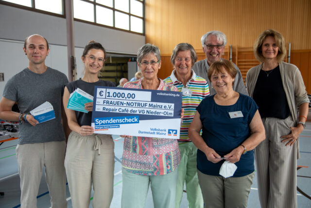 VG-NIEDER-OLM/ZORNHEIM – Reparieren statt wegwerfen und dabei noch etwas Gutes tun. Das ist seit über zehn Jahren das Konzept des Repair Cafés des Seniorenbeirates der Verbandsgemeinde Nieder-Olm. Bisher hat das Team rund 4000 Geräte untersucht und in über 70 Prozent der Fälle, meist zusammen mit den Besitzern, das Problem behoben und damit das Gerät vor dem Wegwerfen bewahrt. „Hilfe zur Selbsthilfe leisten“ ist das Motto der ehrenamtlichen Bastler, Tüftler und Reparierer, die ihre Dienste regelmäßig in den verschiedenen Hallen der Verbandsgemeinde anbieten. Kürzlich war das Repair Café zu Gast in der Zornheimer Lindenplatz Halle. Organisator Eberhard Rathgeb hatte zu diesem Termin auch die Gleichstellungsbeauftragte der Verbandsgemeinde Nieder-Olm, Inge Brauburger, sowie eine Vertreterin des Frauen*Notrufs Mainz e.V., Sabine Wollstädter, und einen Vertreter der Männer*Beratung, Yassin Suza, eingeladen. Denn in regelmäßigen Abständen gibt das Repair Café den Erlös aus dem Spendenkörbchen für die ehrenamtliche Arbeit an einen guten Zweck im nahen Umfeld weiter, aber auch darüber hinaus. „Meine Frau hatte die Idee, dieses Mal etwas für Frauen zu spenden“, erzählt Rathgeb. Daher sei er auf die Gleichstellungsbeauftragte Inge Brauburger zugegangen, um zu erfragen, wen man mit der Spende bedenken könne, so Rathgeb. „Ihr Vorschlag, für den Frauen*Notruf zu spenden, fiel bei unserem Team auf fruchtbaren Boden“, berichtet Rathgeb.