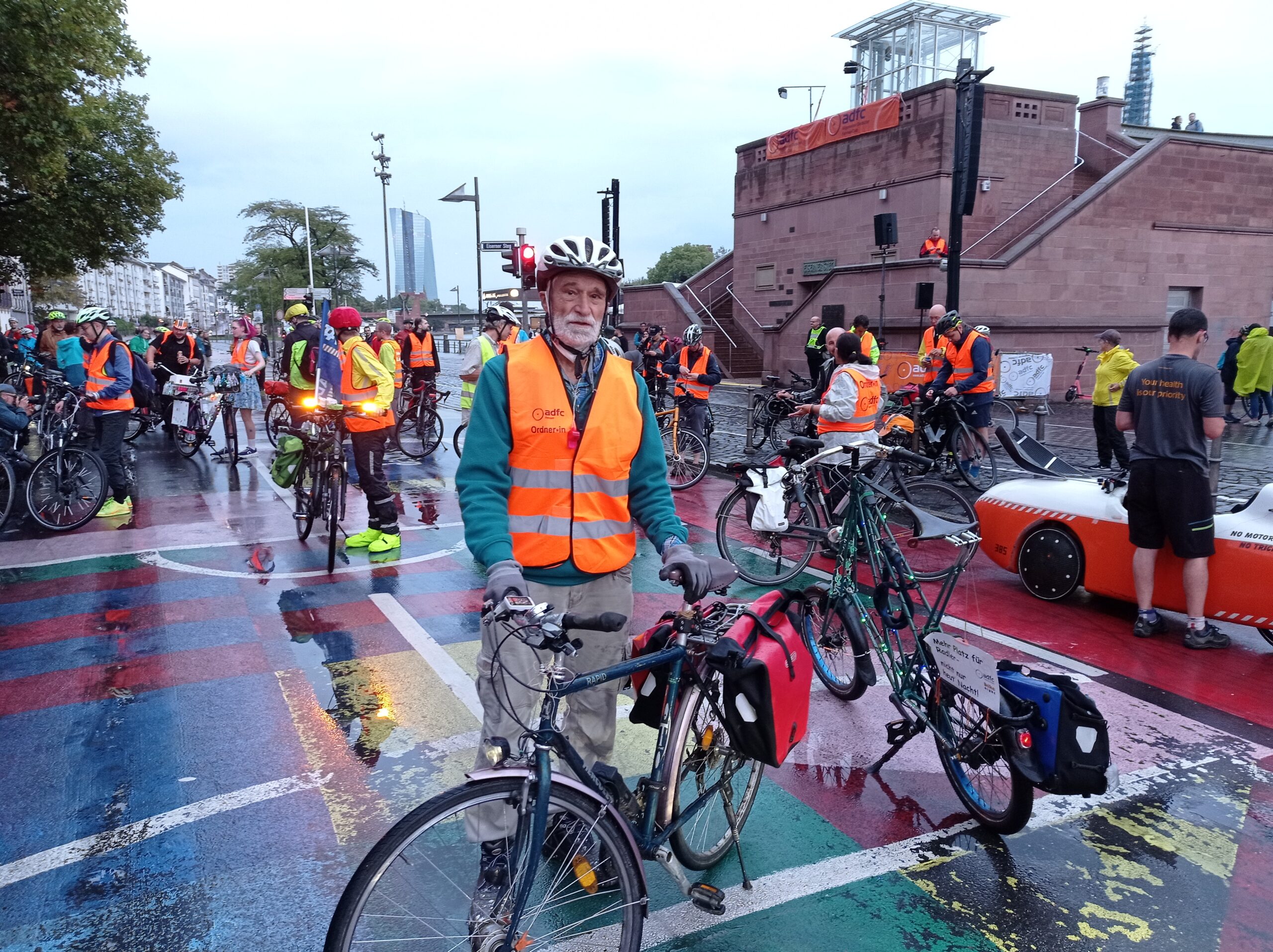 Für mich war auch diese Fahrt wieder ein tiefgreifendes Erlebnis. Begleitet von motorisierten Ordnungshütern wiederholt rote Ampeln zu überfahren oder – vor Jahren noch unvorstellbar – mit dem Rad die Autobahn völlig legal zu benutzen, das hat man nicht jeden Tag. Ach so: Wir Ordner mussten ganz vorne hinter den ersten Polizeimotorrädern fahren. Diese sperrten an Kreuzungen den Seitenverkehr ab und fuhren dann zur nächsten Kreuzung. Wir übernahmen dann diese Absperrung, bis der Demo-Zug vorbei war und der letzte Polizist am Zugende uns das vereinbarte Zeichen gab. Dann hieß es für uns, so schnell wie möglich den gesamten Zug auf der linken Seite zu überholen, die Zugspitze zu erreichen und uns dort für den nächsten Einsatz bereit zu halten.