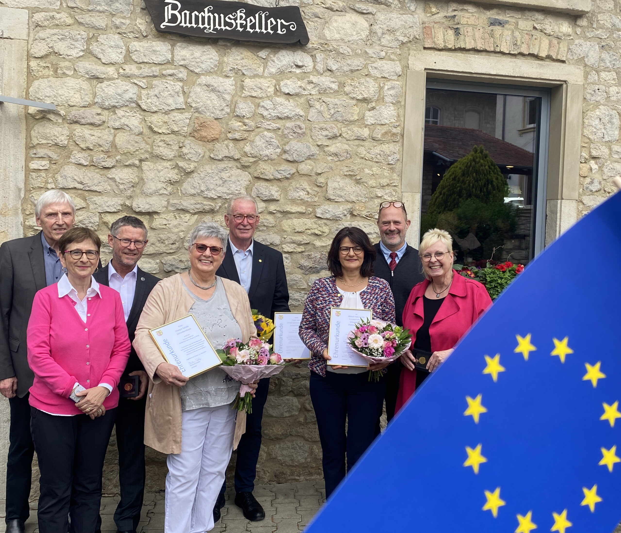 OPPENHEIM/SCHWABSBURG Frieden und Freundschaft sind in Europa nicht mehr selbstverständlich – wie uns der Krieg in der Ukraine seit über einem Jahr vor Augen führt. Kommunale Partnerschaften sind daher ein wichtiger Baustein, um Brücken zu bauen und Kriege zu verhindern. Mit Leben erfüllt werden diese Verbindungen dank der vielen Ehrenamtlichen. In Oppenheim und Schwabenheim dankte Landrätin Dorothea Schäfer nun vier engagierten Persönlichkeiten und einem Freundschaftskreis für deren unermüdlichen Einsatz und zeichnete sie mit der Ehrenmedaille für besondere Leistungen zur Förderung der Städte- und Gemeindepartnerschaften aus. „Der Europäischen Union, dem ganzen Kontinent und nicht zuletzt allen Menschen, die hier leben, kann es nur guttun, wenn sich mit kommunalen Partnerschaften eine echte Bürgerbewegung über alle Ländergrenzen hinweg etabliert“, sagte Landrätin Dorothea Schäfer und dankte den Brückenbauern für ein friedliches Europa: „Denn wer sich kennen- und lieben gelernt hat, der will auch in Frieden miteinander leben.“