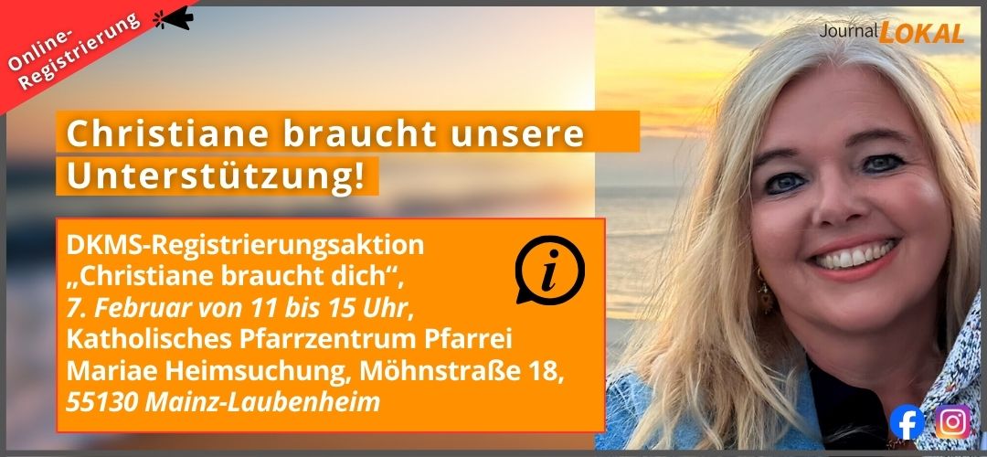 DKMS-Registrierungsaktion „Christiane braucht dich“, 7. Februar von 11 bis 15 Uhr, Katholisches Pfarrzentrum Pfarrei Mariae Heimsuchung, Möhnstraße 18, 55130 Mainz-Laubenheim;