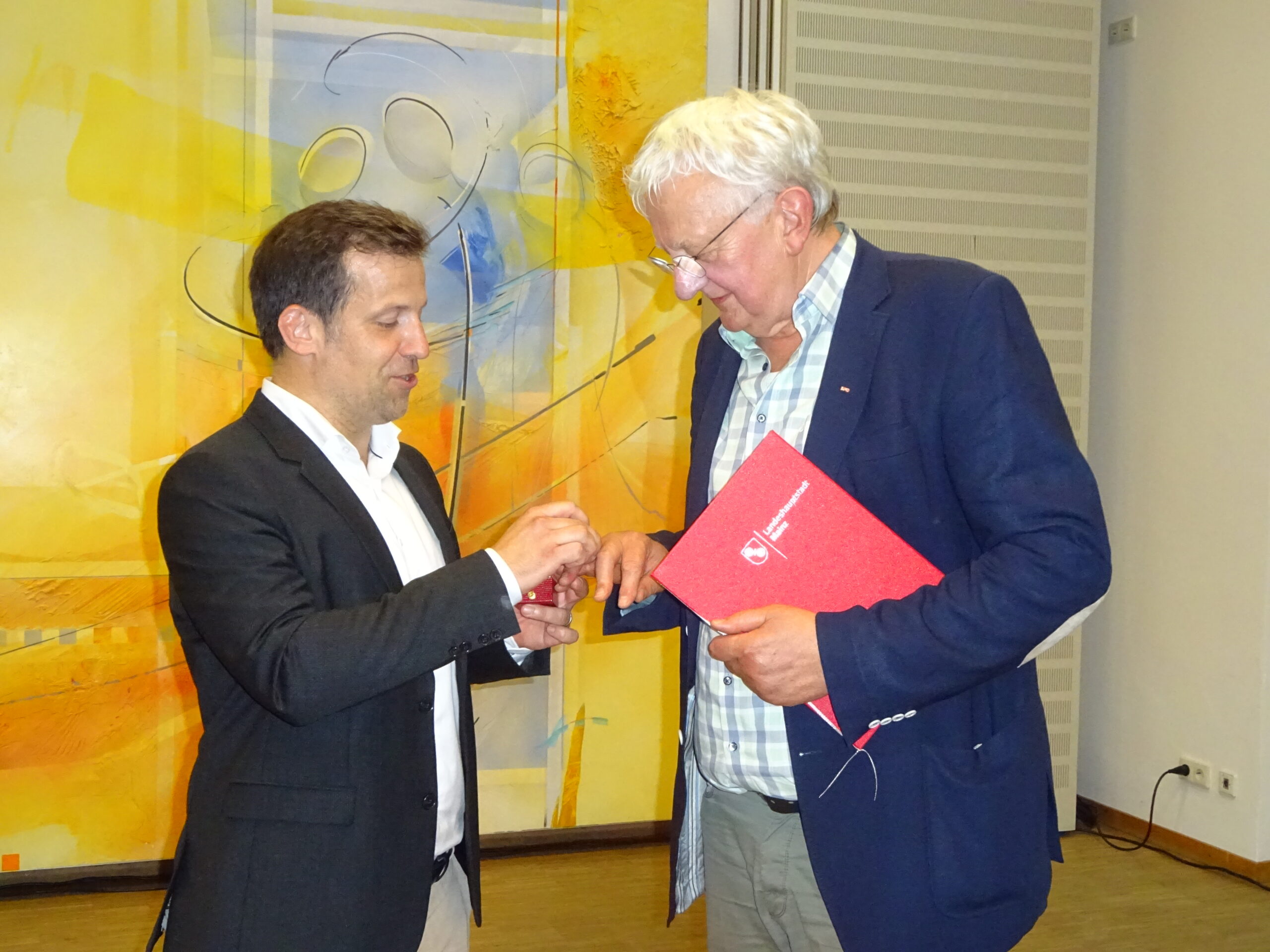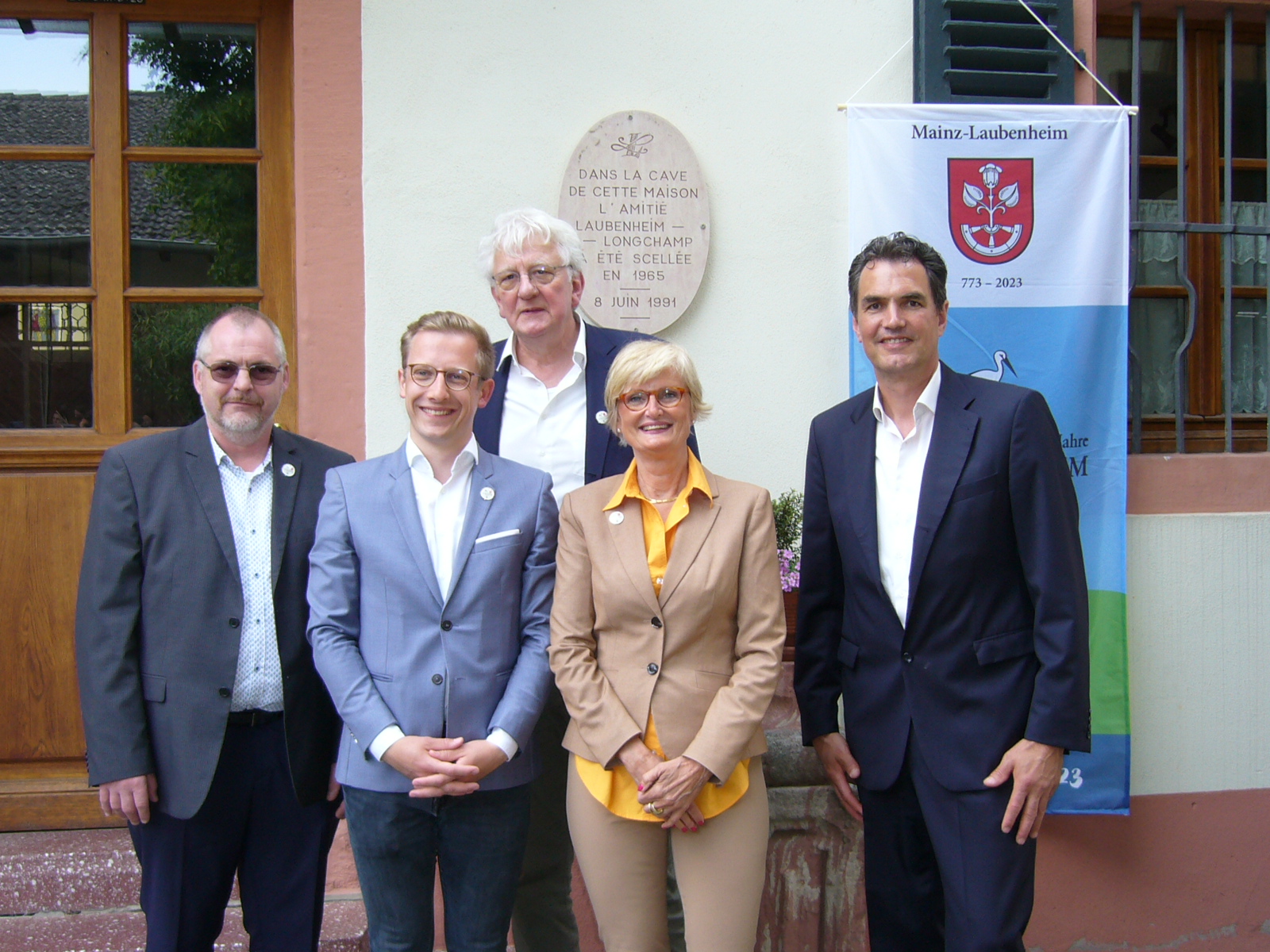„Sie sind ein großer Ortsvorsteher“, lobte OB Nino Haase nicht nur im Bezug auf die Körperlänge des gebürtigen Sauerländers. „Mit ihrer lockeren, humorvollen Art haben Sie für gute Laune gesorgt.“ 15 Jahre lang habe Gerhard Strotkötter sein Amt mit viel Herzblut und stets einem offenen Ohr für die Sorgen der Bürgerschaft ausgeübt. „Laubenheim für alle“ sei stets sein Motto gewesen, er sei stets nah dran an den Leuten gewesen. Der Sozialdemokrat setzte sich für die Erweiterung des katholischen Kindergartens, die Rheinufergestaltung, die Vertiefung der Freundschaft zur französischen Partnergemeinde Longchamp und die Neugestaltung des Laubenheimer Parks ein. Ortsführungen, Weinbergwanderungen, Führungen durch das Laubenheimer Ried: All das bot Gerhard Strotkötter an, der Mitglied in einem Dutzend Laubenheimer Vereine ist. So sorgte „der Gerd“, wie er in Laubenheim nur genannt wird, für ein besonderes Miteinander in Laubenheim. Ein Highlight war die 1250-Jahr-Feier von Laubenheim im vergangenen Jahr mit einer Serie von rund 50 Einzelveranstaltungen. „Der Storch war allgegenwärtig“, lobte OB Haase. „Das bleibt im Gedächtnis der Laubenheimer.“ Als Würdigung für sein großes Engagement überreichte er Gerhard Strotkötter den Ehrenring der Stadt Mainz.
