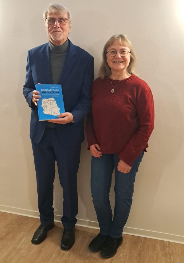 Eine Zuhörerin fragte begeistert, ob sie den an die Wand geworfenen Absatz aus Carl Zuckmayers „Des Teufels General“ vorlesen dürfe, in dem der Autor in Worten das Bild von der „Völkermühle am Rhein“ zeichnet und die laut Post eben zu der Vielfalt der Rheinhessischen Mundarten geführt habe. Es war ein vergnüglicher Abend, es wurde viel gelacht und gestaunt: Eine Frau nannte sprachliche Unterschiede zwischen Weisenau und Laubenheim. Erstere sagen sie springen „in de Rhei nai“, letztere springen „in de Rhoi anoi“. Mundart aus dem Wormser Raum, aus Alzey, Mainz und Oppenheim und aus dem Umkreis von Bad Kreuznach wurde zum Besten gegeben und am Ende gab es großen Applaus. Nicht nur für den Referenten, sondern auch für die Zuschauer. Claudia Stein und der 1. Vorsitzende des Heimat- und Verkehrsvereins, Klaus-Dieter Rank, überreichten ein Weinpräsent an Rudolf Post, dann konnten die Gäste das Buch zum Thema erwerben und sich zu einem Schoppen zusammensetzen.