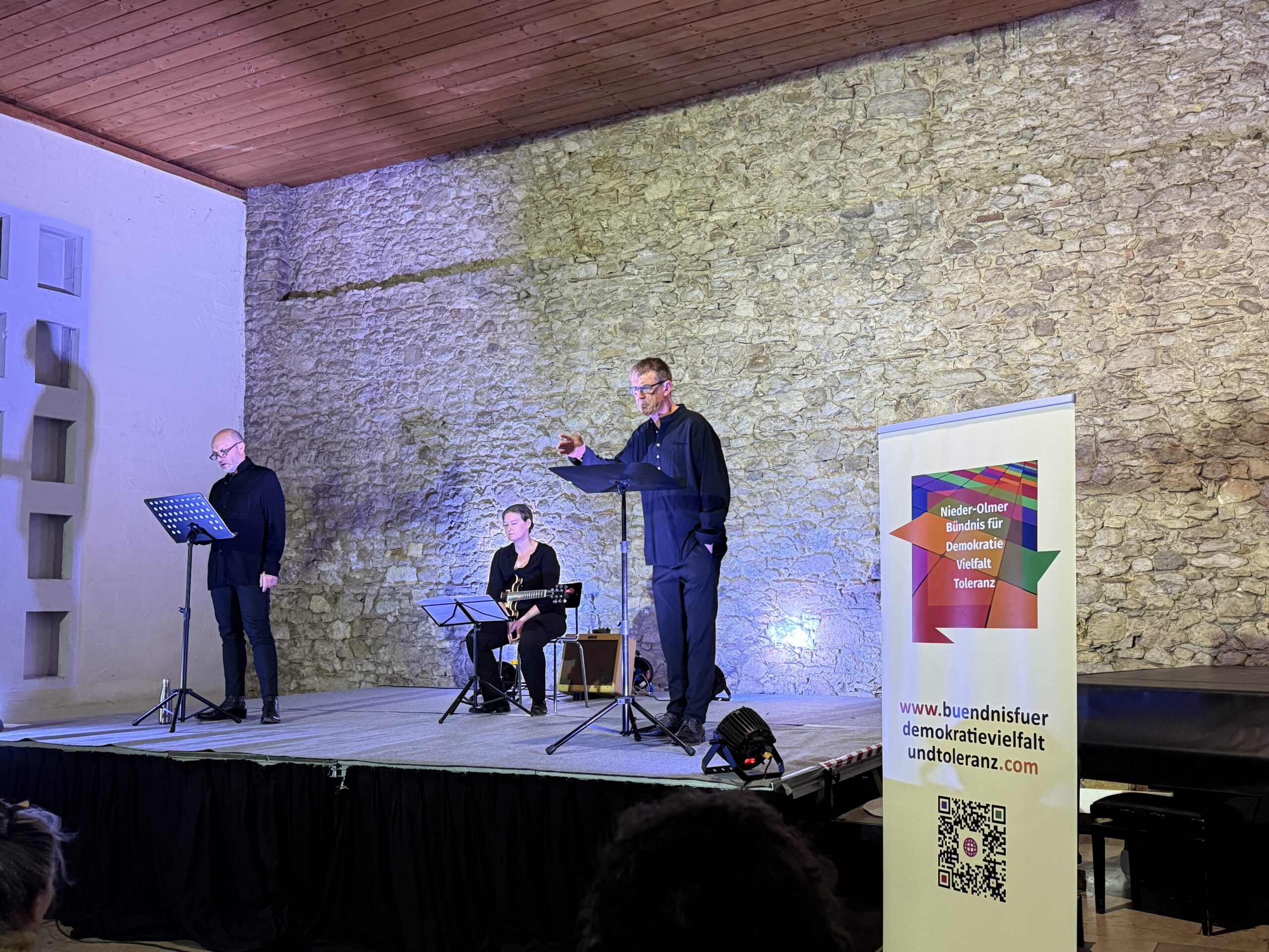 Im Nieder-Olmer Camarahaus lasen und spielten die beiden mitreißende Texte, zum Beispiel von Kurt Tucholsky und Erich Kästner. Menschenwürde und Menschenrechte, die zentralen Werte der Demokratie, standen dabei im Mittelpunkt. Eindrucksvolles Theater, das mit sparsamer Mimik und Gestik ganz auf die Kraft des Wortes setzte– und auf die stimmungsvollen musikalischen Akzente der Gitarristin Katrin Zurborg. Eingeladen dazu hatte das Nieder-Olmer Bündnis für Demokratie, Vielfalt und Toleranz, das sich parteiübergreifend seit bald zwei Jahren mit vielfältigen Veranstaltungen für den Fortbestand der Demokratie wie wir sie kennen einsetzt. Für die kommenden Monate stehen weitere spannende Veranstaltungen auf dem Programm.
