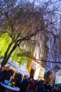 Im Hof konzentrierte sich das Marktgeschehen bewusst auf wenige, ausgewählte Stände. Weihnachtliche Artikel und kulinarische Kleinigkeiten standen im Angebot, doch der Charakter des Marktes wurde nicht vom Verkauf bestimmt. Das Ambiente prägte das Geschehen. Menschen verweilten im Gespräch, die Kinder bewegten sich frei im Garten, und keinen störte es. Im Garten begleitete die ÖkuBrass Band das Marktgeschehen, in der Kirche selbst fand ein Konzert statt. Die Kirche wurde nicht nur Kulisse, sondern aktiver Teil des Marktes. Die offene Kirchentür wirkte durch das Wärmeversprechen – der Innenraum war gut beheizt – einladend, und viele nutzten die Gelegenheit, die Kirche zu besichtigen und samt der Musik auf sich wirken zu lassen.