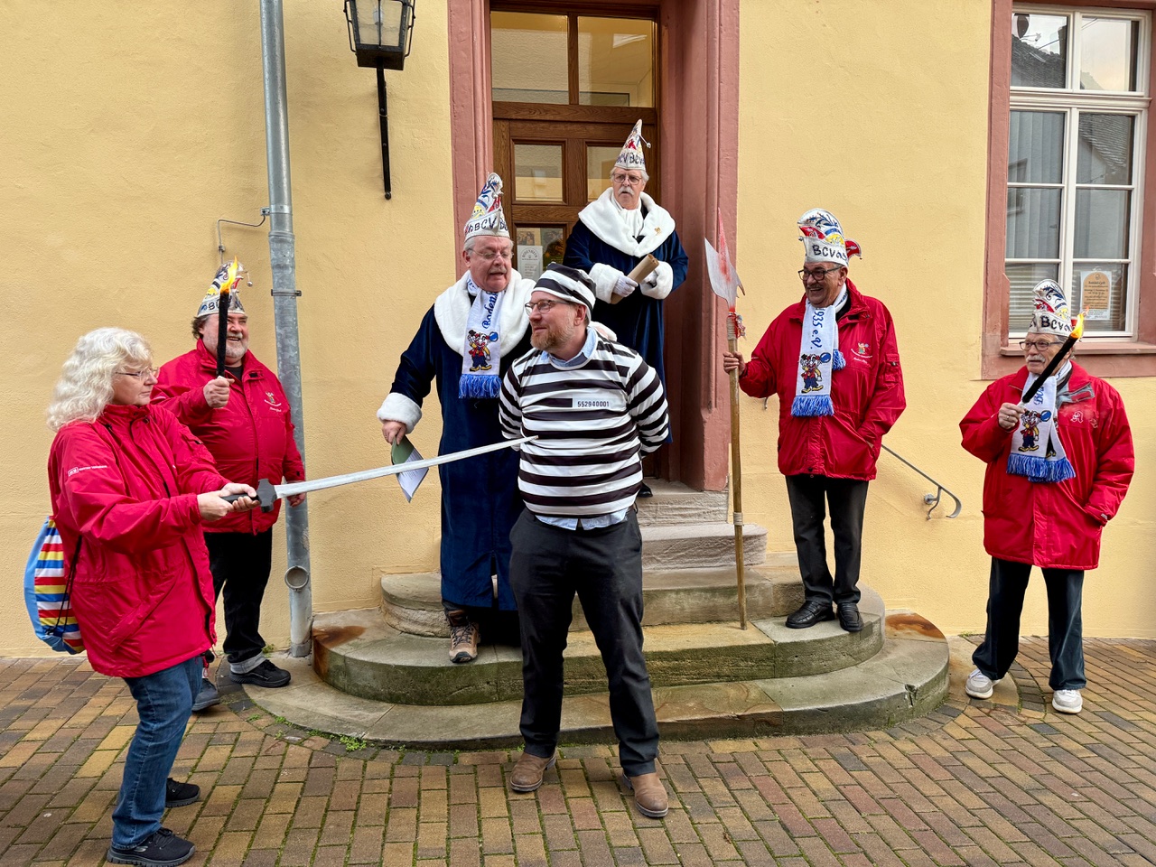 BODENHEIM – Punkt 16.11 Uhr bebte der Boden vor dem Alten Historischen Rathaus in Bodenheim und mit ihm der Stuhl des Ortsbürgermeisters: Der Vorstand des Bodenheimer Carneval Vereins (BCV) marschierte auf – in Uniformen und ohne Pardon. Binnen weniger Minuten wurde das Rathaus gestürmt, Ortsbürgermeister Jens Mutzke (SPD) in Sträflingsstreifen gesteckt, in Ketten gelegt und zu seiner eigenen Überraschung aus dem Rathaus geleitet. Bodenheim wurde übernommen: nicht vom Gemeinderat, sondern von den Narren.