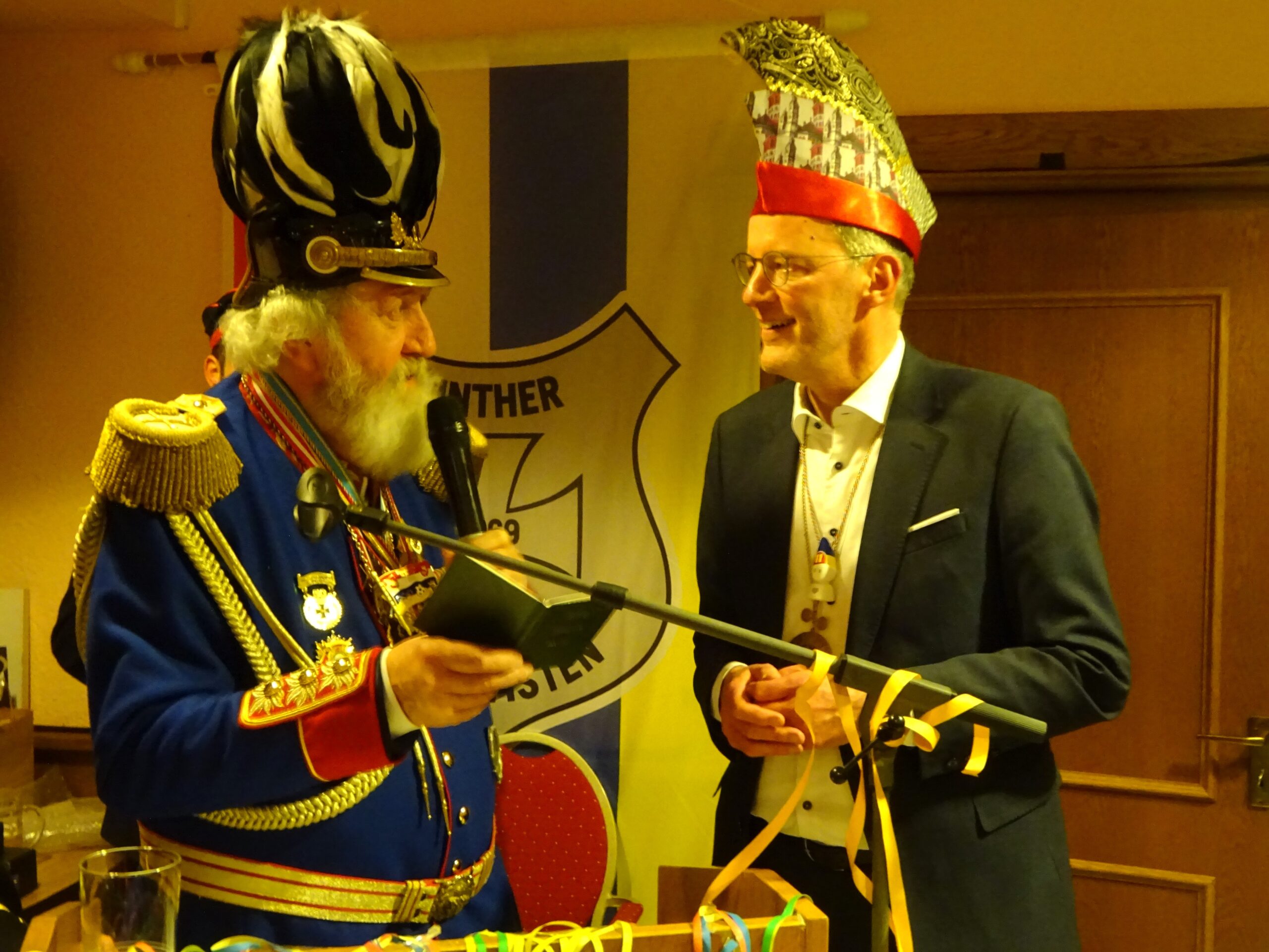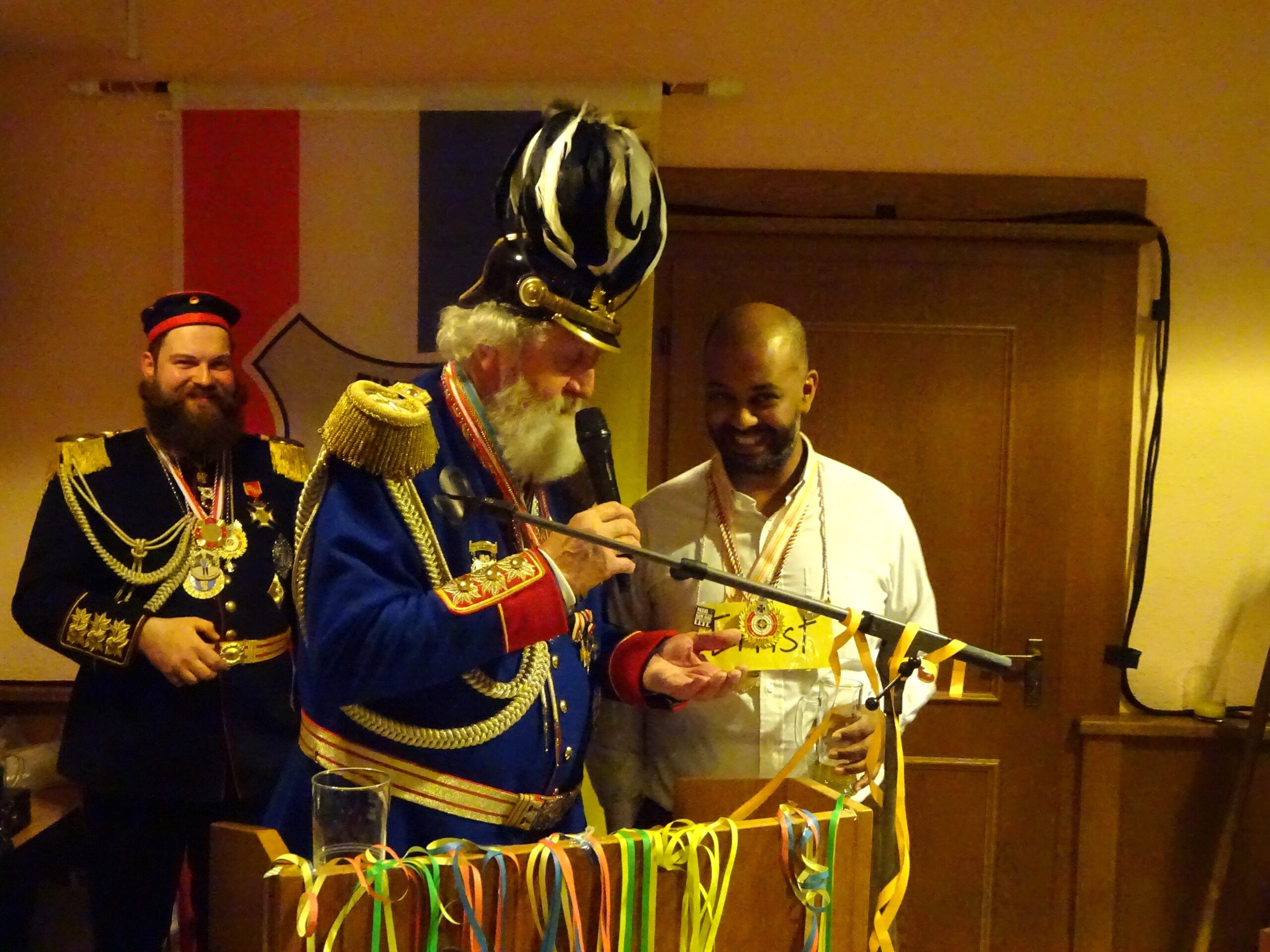 Als Ehrengast kam daraufhin Innenminister Michael Ebling nach vorne. „Du hast doch gute Beziehungen zu Donald Trump“, sagte Werner Simon zu Ebling. „Frag’ ihn doch mal, ob er auch Gunsenum kaufen kann!“ Uiuiuiuiuiuiui. Auf „Michael Franz Ebling, bekannt als Schoppe-Michel“, war ein Finther Reisepass ausgestellt, der dem Innenminister überreicht wurde. Ebling bedauerte, dass sein Weinpräsent an die Reservisten von den Schokos an der Grenze abgenommen worden sei. Schade.