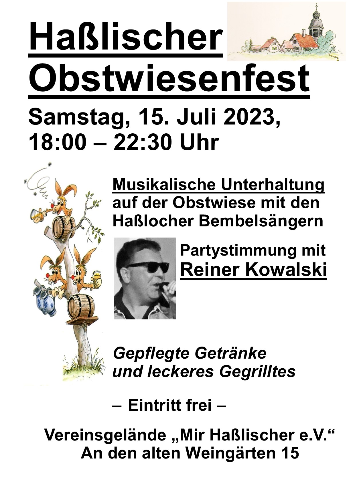 RÜSSELSHEIM/HAßLOCH – Der Haßlocher Brauchtumsvereins „Mir Haßlischer“ lädt am Samstag, dem 15. Juli 2023, ab 18:00 Uhr, bei freiem Eintritt zum Haßlocher Obstwiesenfest auf sein Vereinsgelände, An den alten Weingärten 15 – nahe Haßloch – ein. Auf der großen Terrasse und der Obstwiese kann man beschaulich im Grünen sitzen und sich trefflich musikalisch unterhalten lassen.