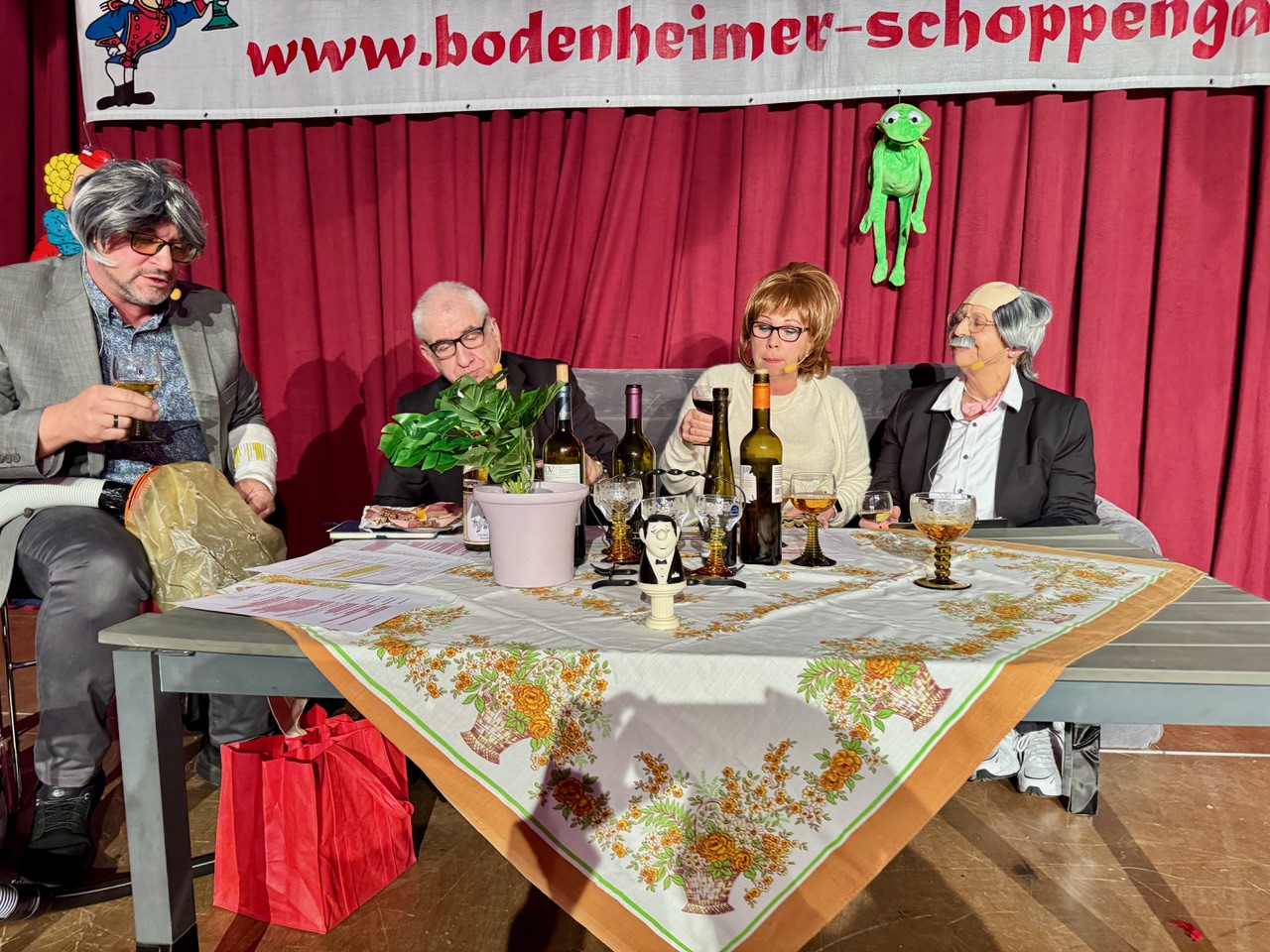 Nach der Pause das traditionelle Loriot-Stück, diesmal „Fastnacht bei den Schoppenstädts“. Perfekt gespielt von Conny Schäfer als Dame des Hauses, Udo Maurus als Weinvertreter, Karl Krämer als Fachmann für den Staubsauger „Heinzelmann“ und Kerstin Berner von der Versicherung. Zum Brüllen komisch – besonders die Weinsorten „Nackenheimer Rotarsch“ und „Lörzweiler Zuckerwasser Cuvee“ sorgten für Lachsalven.