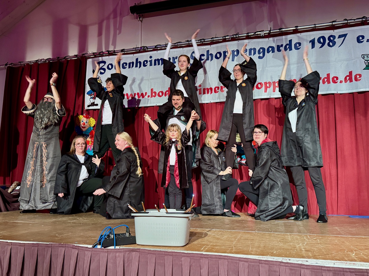Ein Höhepunkt war das Showballett der BSG, das die Zuschauer nach Hogwarts entführte. Mit viel Liebe zum Detail, starken Choreografien und einem zauberhaften Auftritt der siebenjährigen Lina Baptistella, die den Großen mühelos Paroli bot, wurde Harry Potter lebendig. Gewohnt treffsicher nahmen Depp, Doof, Dappisch und Dumm – Richard Sommer, Holger Stephan sowie Ralf und Volker Schäfer – das Bodenheimer Geschehen und weltweite Ereignisse aufs Korn. Danach zeigte sich professionelle Fastnacht mit den Altrheinstromern, die als „Diebe“, ausgebildet von der höheren Räuberschule Mombach, den Saal zum Schunkeln und Mitsingen brachten.