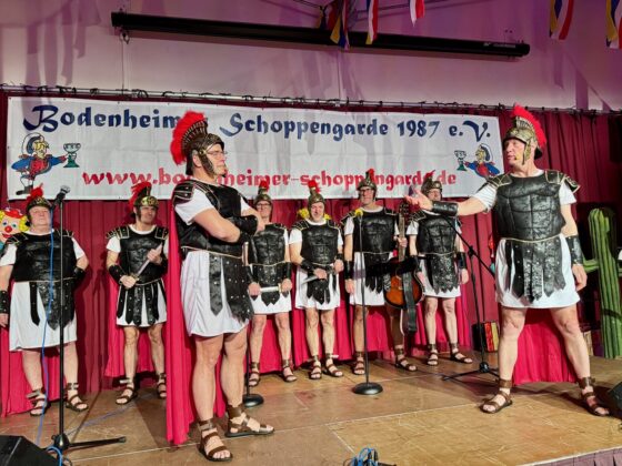 Den Auftakt machten die Albansjünger, die als römische Legion aufmarschierten: Julius Cäsar kam höchstpersönlich nach Bodenheim – zu den „schönsten Frauen Germaniens und dem bestem Wein“. Musikalisch ging es traditionsreich weiter mit dem befreundeten 1. Bergsträßer Spielmanns- und Fanfarenzug, der Fastnachtsklassiker ebenso mitbrachte wie lateinamerikanische Rhythmen. Und ein frühes funkensprühendes Highlight lieferten die Donkey Dancers vom Bodenheimer Carneval Verein. Ihre Weltreise voller Kreativität und Charisma ließ den Saal jubeln. Danach heizte das Duo Hottvollee mit Meenzer Liedern zum Mitsingen ein.