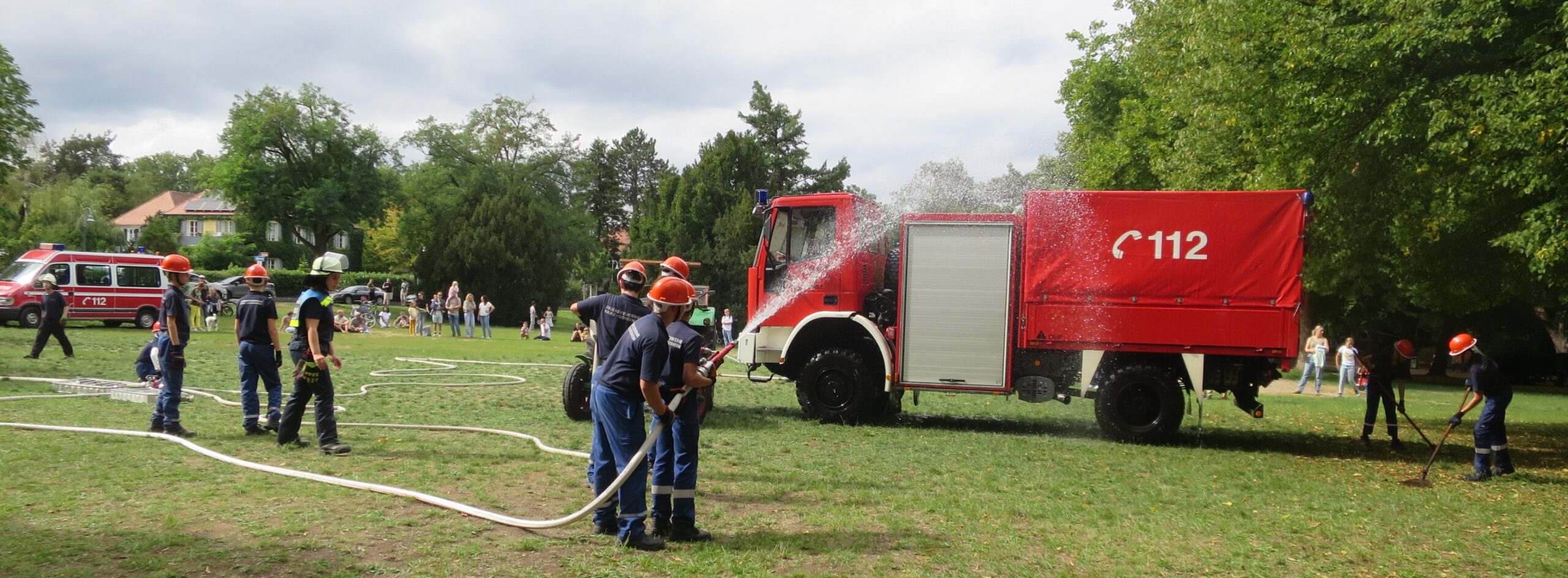 Nun durften alle Kinder, die es gerne wollten, einmal selbst Löschungen mit Strahlrohren vornehmen. Der Andrang war riesig, aber jeder, der wollte, durfte ran. So manches Elternteil bekam dabei vom eigenen Kind eine kleine Dusche ab. Auch der Ortsvorsteher musste das am eigenen Leib erfahren, doch die Temperaturen ließen die Abkühlung zu.