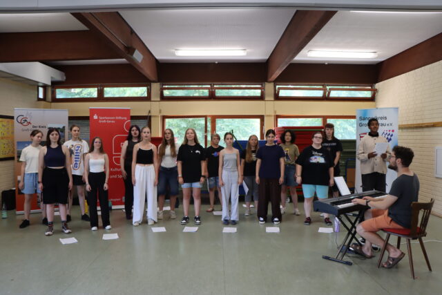 Projektstart war bereits im vergangenen Jahr. Es gab insgesamt 14 Treffen, um über die Organisation, Ziele und Erwartungen zu sprechen. Das Ergebnis war nun die erste Jugend-Singwoche in den Sommerferien 2025. Elke Landau vom Kreiskulturbüro dankte den drei jungen Haupt-Organisatorinnen Anna Küchler, Anja Kresse und Kyra Emmerich vom Jugendchor PopCHORn für deren Engagement. Genauso würdigte sie Dirigent und Dozent Adrian Goldner, der die Gruppe während der Woche federführend begleitet und offensichtlich prima motiviert hat. Weitere Dozenten während nachmittäglicher Workshops waren Marvin Heppenheimer (Thema Bühnenpräsenz), Ben Höhnel (Beatboxing) und Lisa Meier (Vocal Painting).