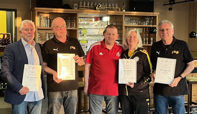 RÜSSELSHEIM – Für ihre Verdienste um den Fußball und den SC Opel Rüsselsheim wurden (von links) Heinz Mehler, Jürgen Gelis, Jasmine Wismar und Jürgen Zülch mit dem Ehrenbrief des Hessischen Fußballverbands (HFV) ausgezeichnet. Kreisschiedsrichterobmann Uwe Lang (Mitte) übergab Urkunden und Ehrennadeln. Uwe Bergmann, der beim Ehrenabend verhindert war, wird die Auszeichnung zu einem späteren Zeitpunkt persönlich erhalten. Was die fünf Mitglieder auszeichnet: