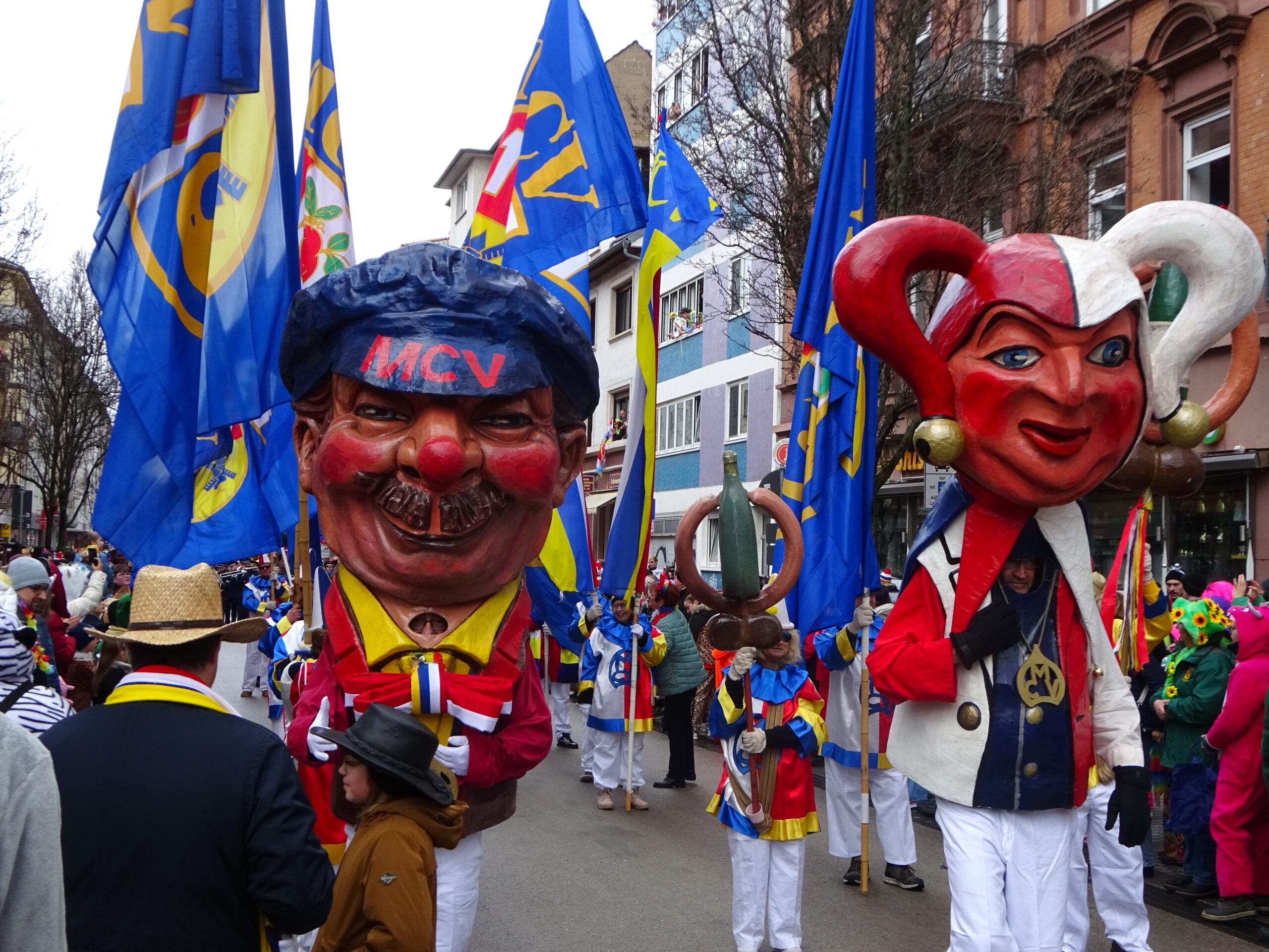 Vorneweg marschierten die Aktiven der Mainzer Rittergilde mit ihren Deutschlandfahnen. Es folgten der Mottowagen, die Fahnenschwenker mit ihren vierfarbbunten Fastnachtsfahnen und die Meenzer Schwellköpp. Diese Symbolfiguren der Mainzer Straßenfastnacht sind aus dem Rosenmontagszug nicht wegzudenken.