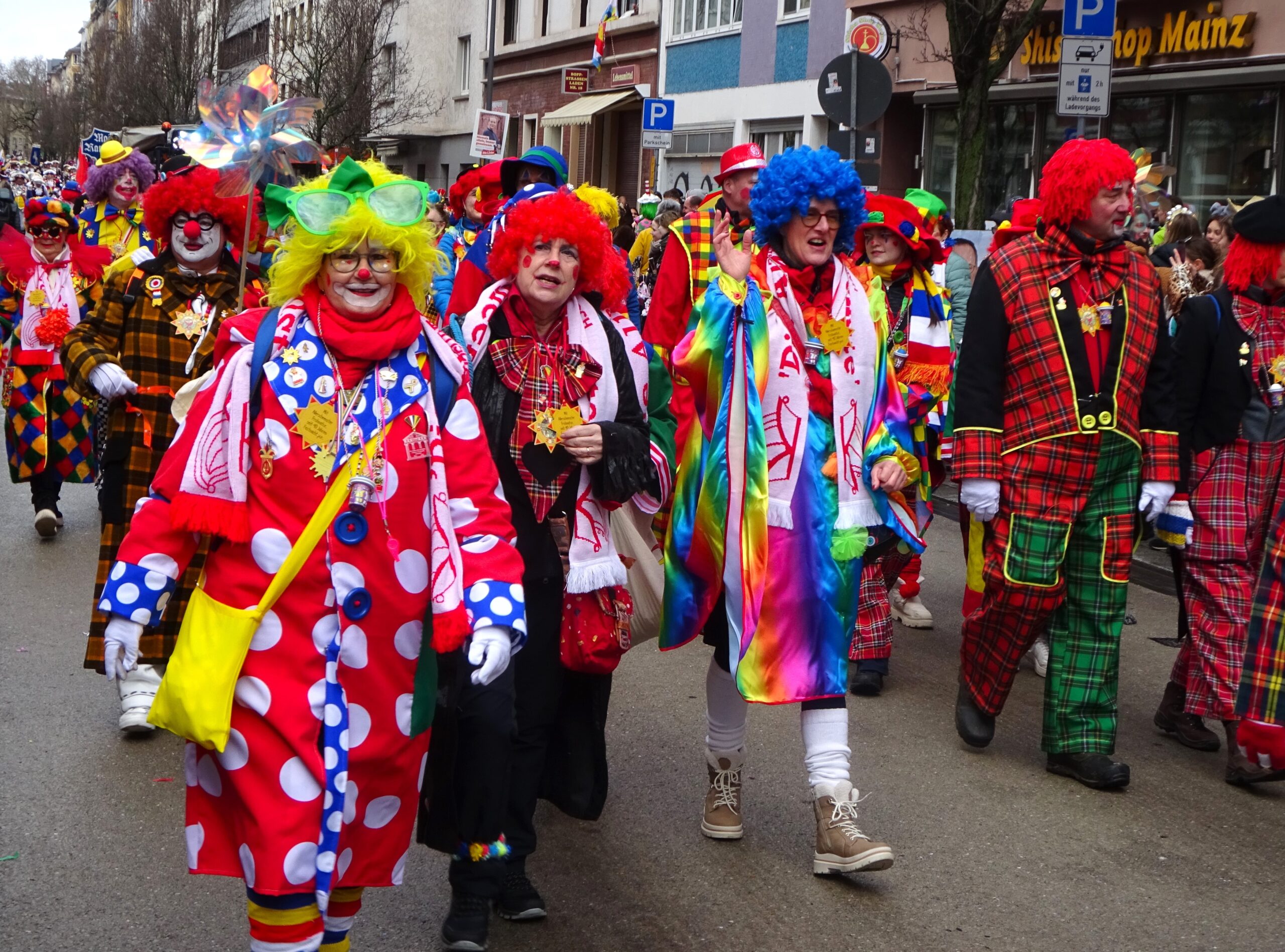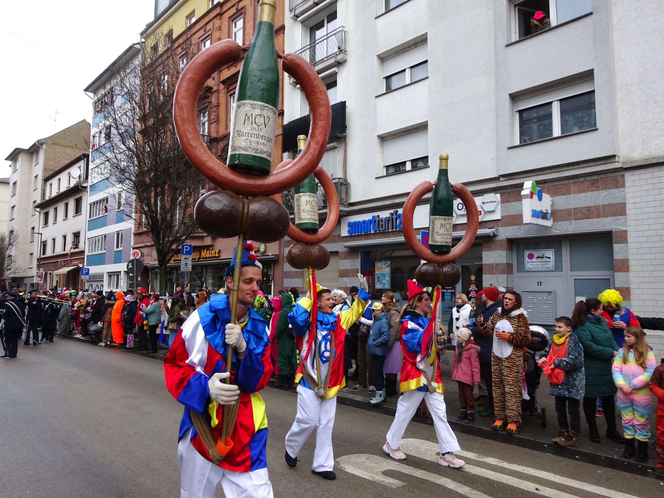 Ebenso dazu gehören in Mainz natürlich „Weck, Worscht und Woi“: Das trugen Aktive des Mainzer Carneval Vereins (MCV) symbolisch durch die Straßen. Schön anzusehen waren auch die Fastnachterinnen und Fastnachter des närrischen Stammtisches „Die Allerscheenste“ in ihren vierfarbbunten Kostümen.