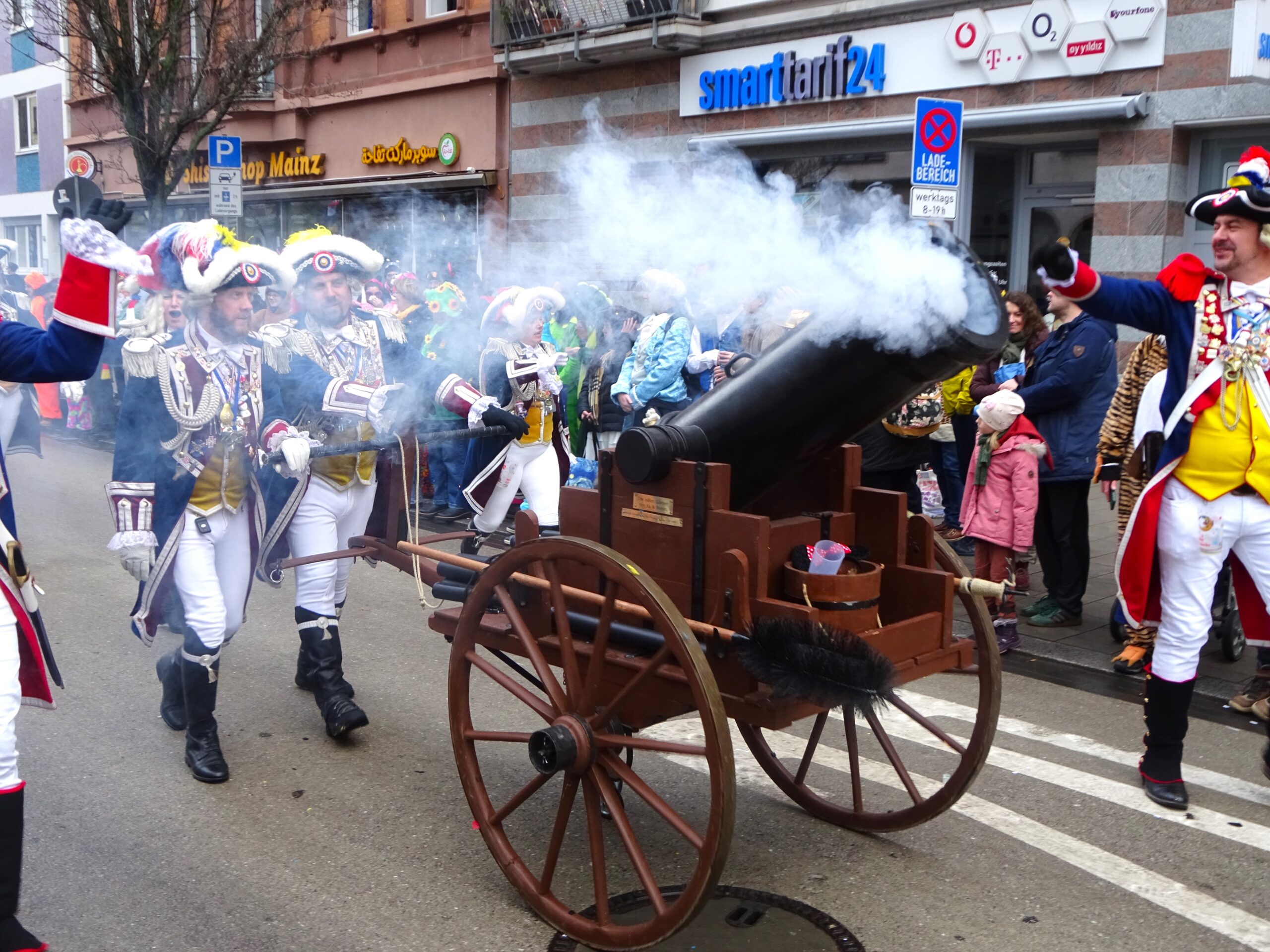 Eine sehr stattliche Abordnung stellte gleich zu Beginn die älteste Garde der Landeshauptstadt, die Mainzer Ranzengarde. Diese ließ es mit ihren rollenden Kanonen richtig krachen.