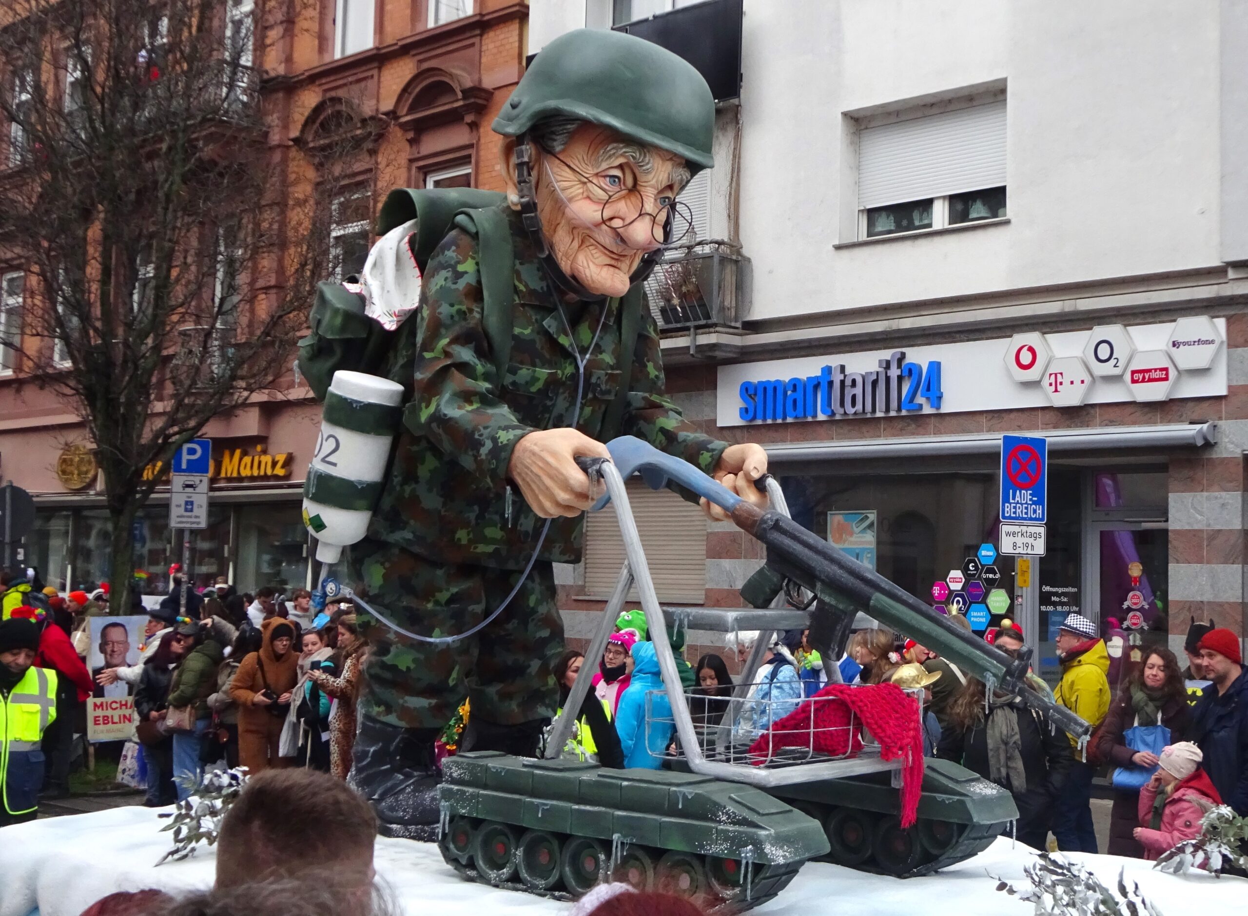 Nicht wegzudenken aus dem Rosenmontagszug sind die närrischen Motivwagen des MCV. Einer hatte das Thema „Aktivrente“: Das wurde vom MCV so erklärt: „Weil der Bund braucht dringend Leit, / macht selbst die Oma sich bereit. Rollt an sie mit ihr’m ,Kampfrollator’, / wird sie zum grünen Terminator.“ Uiuiuiuiuiuiui.