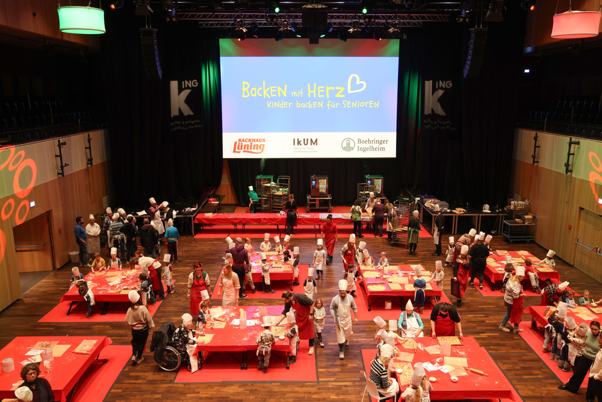 INGELHEIM – Es duftet nach Zimt und Vanille, Bleche mit frisch gebackenen Plätzchen stehen bereit: Die Kultur- und Kongresshalle (kING) in Ingelheim hat sich Anfang Dezember für einen Tag in eine große Backstube verwandelt. Unter dem Motto „Backen mit Herz“ haben rund 200 Kinder aus Ingelheimer Kindertagesstätten gemeinsam mit Seniorinnen und Senioren mehrere Tausend Weihnachtsplätzchen gebacken. Der generationenübergreifende Backtag sollte ein Zeichen für Zusammenhalt und Mitmenschlichkeit sein, so die Organisatoren von der Ingelheimer Kultur und Marketing GmbH (IkUM).