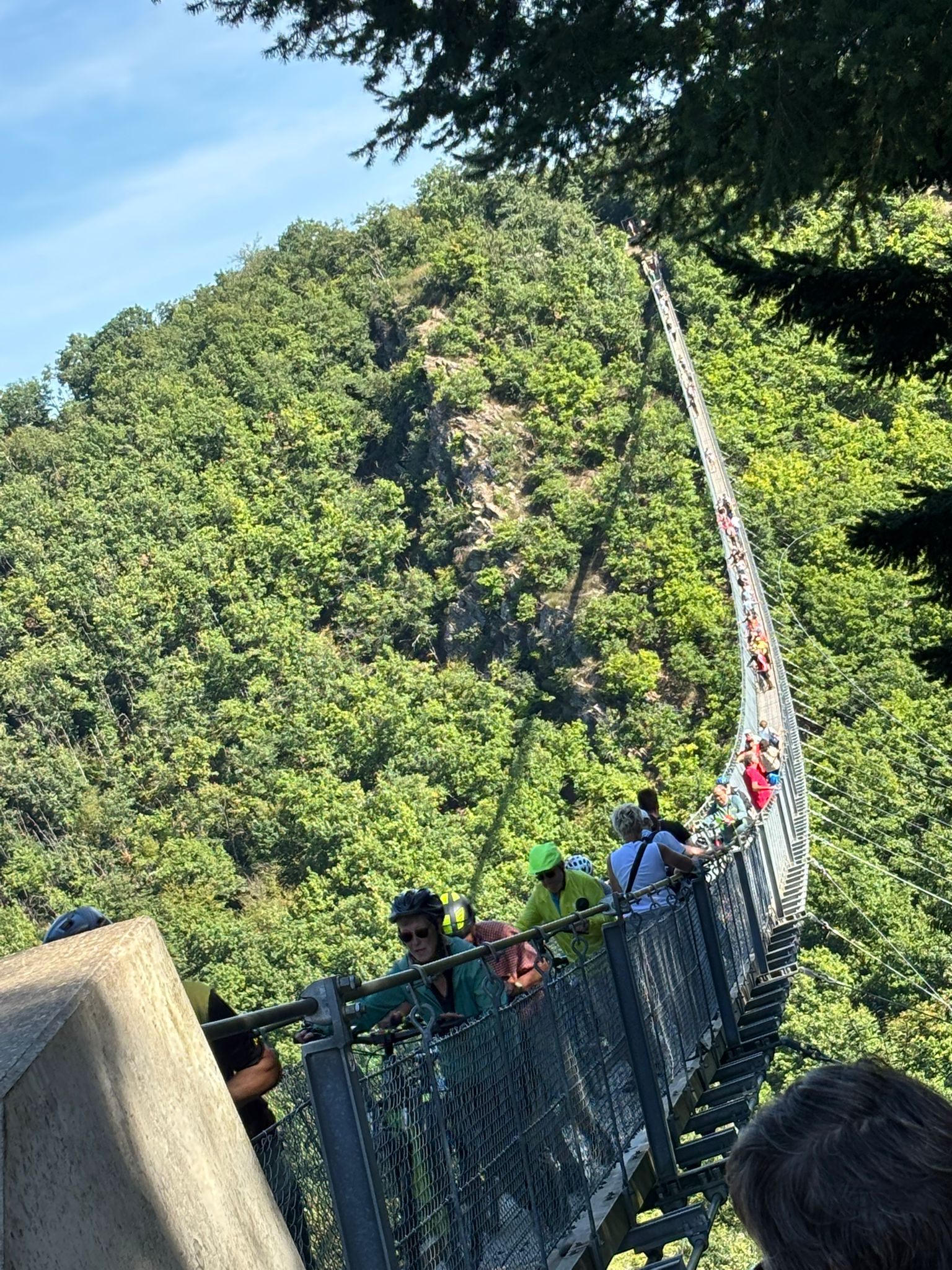 Von Kastellaun aus startete die Gruppe mit ihren Rädern Richtung Mörsdorf. Ziel war die berühmte Geierlay-Brücke mit beachtlichen 390 Metern Länge und 100 Metern in der Höhe. Im Begleitfahrzeug war Platz für Aussteiger, doch fast alle wollten das Erlebnis wagen, erzählt Schön. Im Vorfeld hatte er auf mögliche Höhenängste hingewiesen und sogar einen Shuttle-Service angeboten. „Überraschenderweise haben alle – bis auf eine Mitfahrerin – die Brücke schiebend überquert. Ich hatte großen Respekt, ob das gut ankommt, aber am Ende war es für alle ein echtes Highlight. In der Gruppe traut man sich einfach mehr zu.“