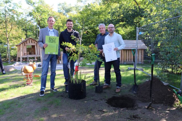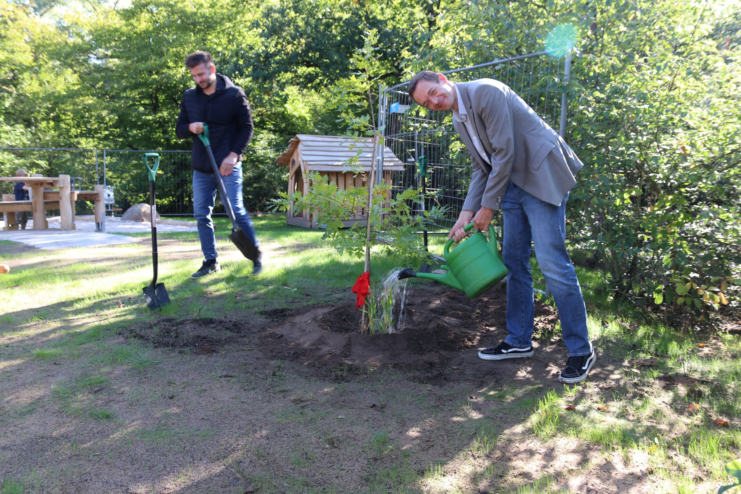 Dies sind Beispiele dafür, wie die Grünplanung die Neugestaltung auf die Bedürfnisse der Nutzerinnen und Nutzer angepasst hat. Zuvor hatte das Kinder- und Jugendbüro ein Beteiligungsverfahren durchgeführt. Neben den Ideen von Kindern der benachbarten WfB-Kindertagesstätte als Hauptnutzer gab es viele weitere Anregungen, da zu den Nutzerinnen und Nutzern auch Spaziergänger, Picknicker, Kinder, Jugendliche und Senioren gehören. Wegen der örtlichen Gegebenheiten ergab sich schnell die Idee zu einem „Räuberdorf“, zu dem mehrere Hütten um einen Sandplatz gehören, der mit einem Weg zum Kletterelement und den Schaukeln verbunden wird. Zur Dorfmitte gehören Picknick-Kombinationen. Rund herum gibt es Aufenthaltsplätze im alten Kiefernwald, der um einheimisches Grün ergänzt wird. An der Stelle, wo eine Kiefer umgefallen war, pflanzte Valerius gleich beim Testtermin als ersten Baum eine junge Flaumeiche, die zu den Zukunftsbäumen zählt und den klimatischen Veränderungen Widerstand leisten kann.