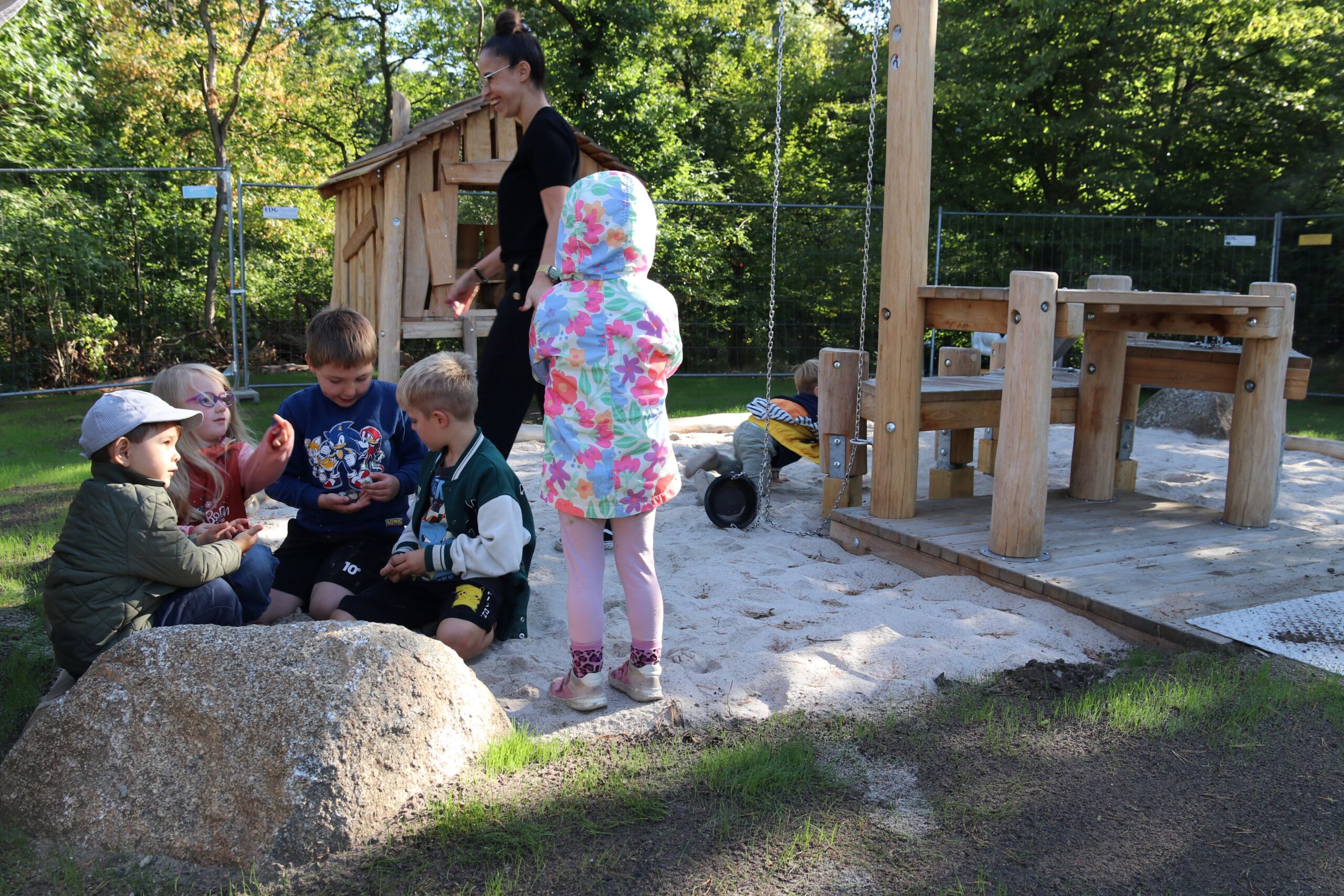RÜSSELSHEIM – Noch bis Ende des laufenden Jahres wird es dauern, bis die Stadt den Spielplatz „Räuberdorf“ am Waldesrand an der Heppenheimer Straße freigeben kann. In der vergangenen Woche konnten sich Kinder der Kindertagesstätte „Am Alten Waldsee“ allerdings schon einmal einen ersten Eindruck von der Neugestaltung verschaffen. Und das Ergebnis der kleinen Testerinnen und Tester war durchweg positiv. Schnell eroberten sie das Karussell, Sitz- und Wipptiere in Gestalt von Schafen, Hund und Katze sowie den Sandkasten.