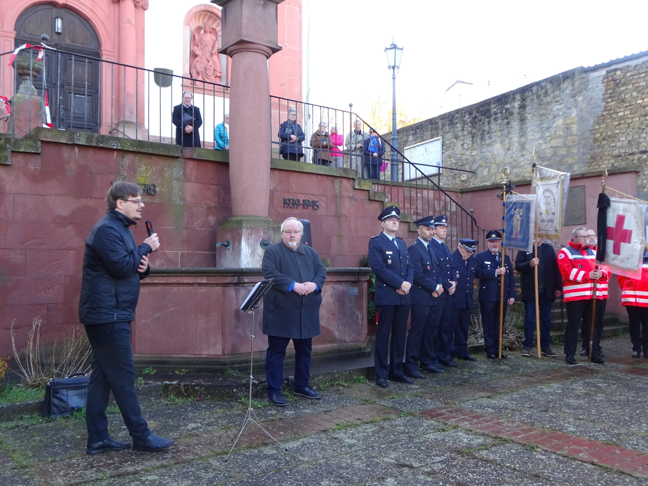 MARIENBORN – Ein würdevolles Gedenken mit rund 50 Vertretern der Politik, der Vereine und der Kirchen fand am Volkstrauertag auf dem Platz vor der Marienborner Pfarrkirche statt. „Wir gedenken der Toten der Kriege in aller Welt und der Toten durch Unrecht und durch Terror“, sagte Ortsvorsteher Dr. Claudius Moseler (ÖDP) zu Beginn der Trauerzeremonie. „Konflikte und Kriege finden noch immer auf allen Kontinenten statt“, mahnte er. Auch multiple Krisen griffen immer mehr um sich. „Der Ton wird rauer“, betonte Moseler. Es liege an der Politik und Gesellschaft, Gesprächskorridore zu schaffen, forderte der Ortsvorsteher und sprach sich gegen den „Krieg in den Köpfen“ aus.