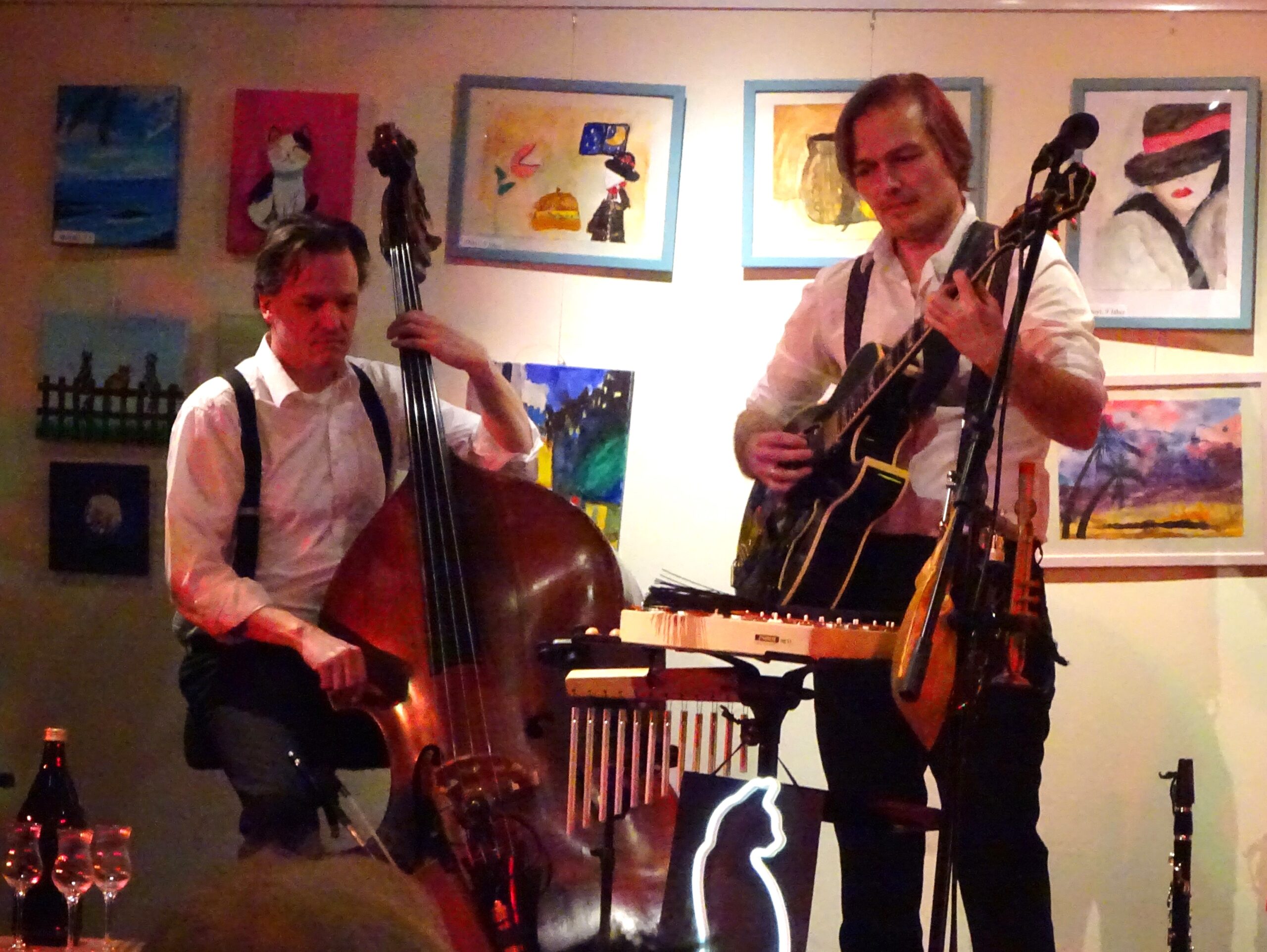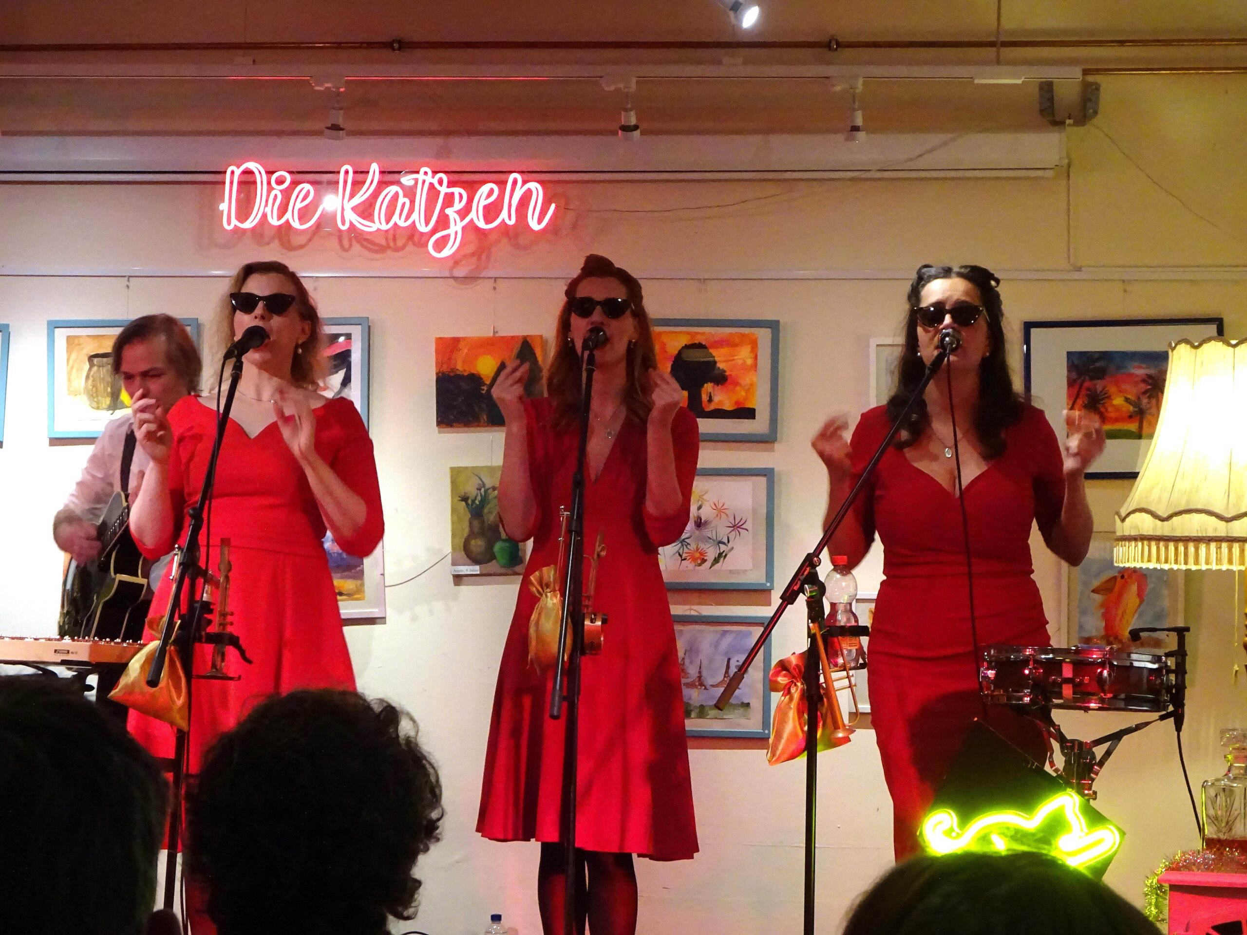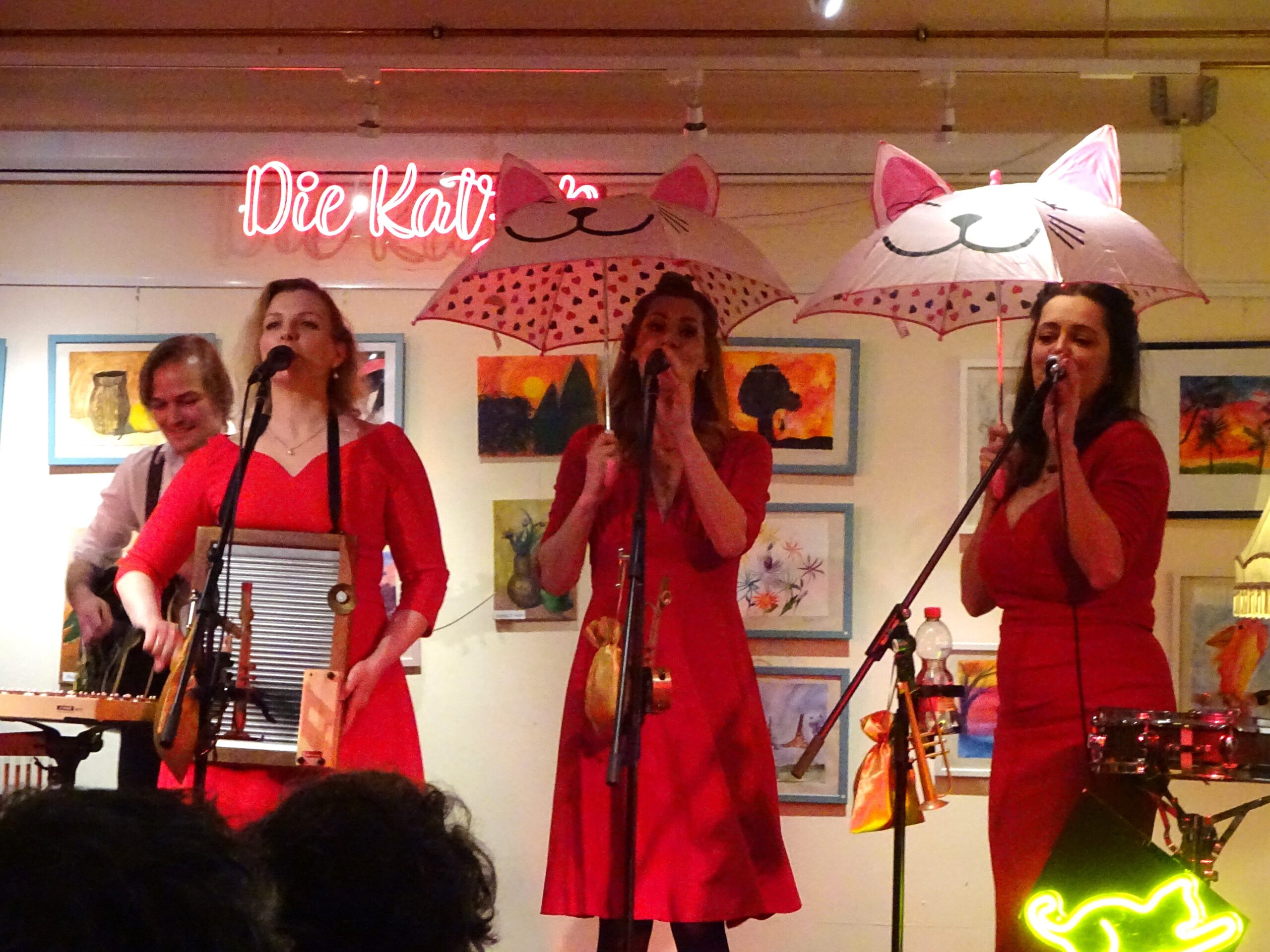 Mit ihrem Erkennungslied „Katzen brauchen furchtbar viel Musik“ starteten Anja Kintscher (Gesang), Sarah Schurig (Gesang), Claudia Seng (Gesang), Jens Mackenthun (Gitarre) und Sebastian Meyer (Kontrabass) ihr Programm. Das Publikum war von Anfang an dabei und spendete für den dreistimmigen Gesang, der perfekt von den beiden Instrumentalisten ergänzt wird, viel Applaus. Winterlich wurde es mit „Walking in the Winter Wonderland“, bei dem die beiden Musiker kurze Soli spielten. Schwungvoll ging es mit „Mr. Sandman“ weiter, ursprünglich gesungen von „The Chordettes“ 1954. Dann zogen sich die drei Sängerinnen weiße Stolen an und sangen das besinnliche „Santa Baby“.