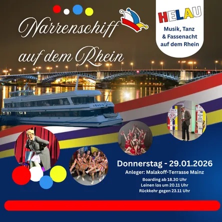 KLEIN-WINTERNHEIM/MAINZ – Wenn sich am 29. Januar 2026, um 20 Uhr – Boarding ab 18.30 Uhr – an der Malakoff-Terrasse in Mainz die Leinen lösen, heißt es wieder: „Volle Fahrt voraus – die Fassenacht schläft heut Wellen!“ An Bord erwartet die Närrinnen und Narren ein buntes, stimmungsvolles Programm mit allem, was die Mainzer Fassenacht ausmacht: Gute Laune, Musik, Tanz und jede Menge „Helau“!
