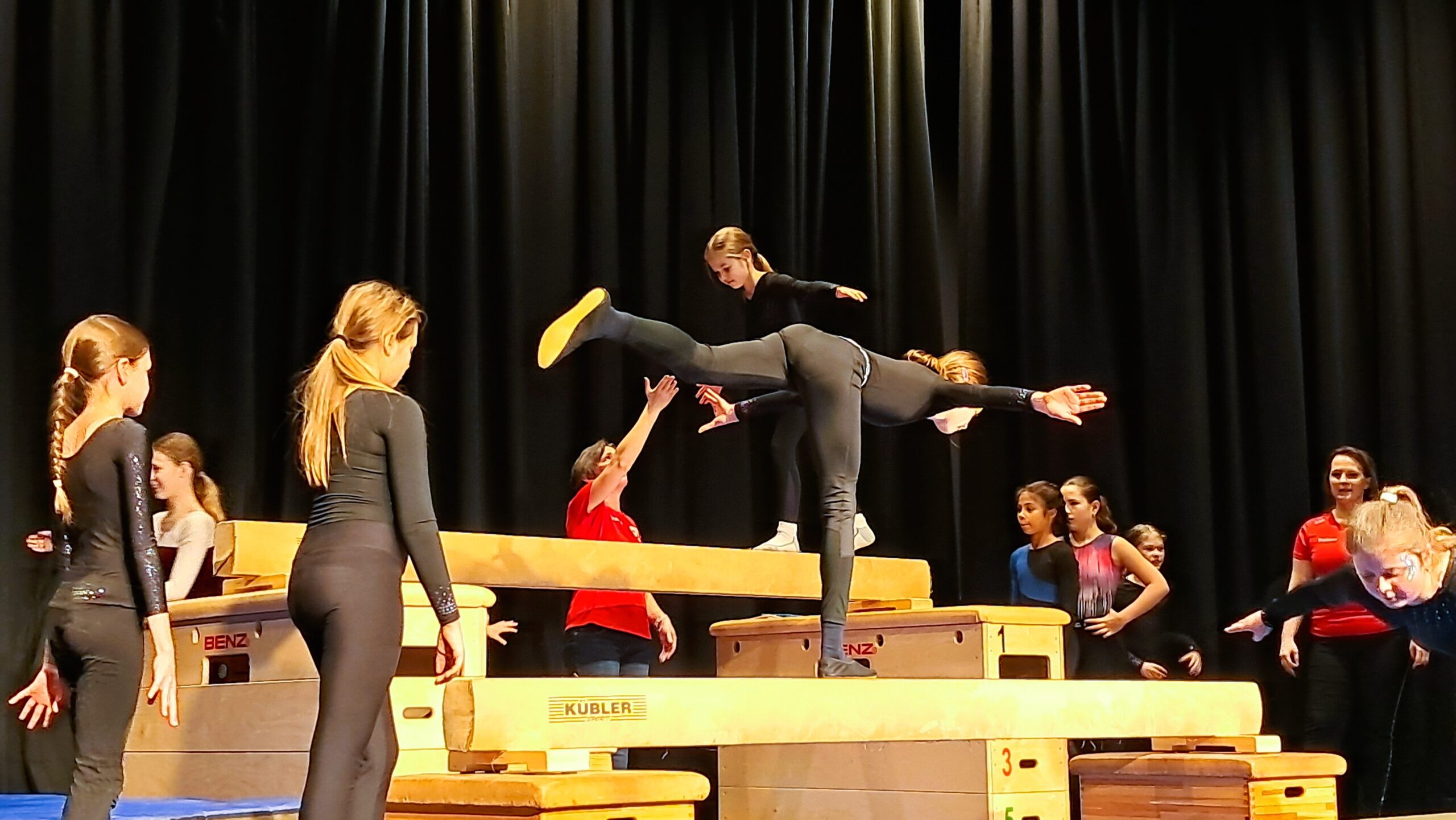 Den Anfang machte die Kleinkinderturngruppe, die mit Unterstützung ihrer Trainerinnen mutig über eine auf höhere Kästen gelegte Bank balancierte, auf Turnmatten hüpfte und sich über eine große Röhre abrollte. Dann kamen auch schon die Rope-Skipper, eigentlich zwölf an der Zahl, krankheitsbedingt aber nur mit fünf Mädchen und ihrem Trainer auf der Bühne. Da muss man schnell sein, und vor allem auch fit. Denn 15 Minuten nur hüpfen und darauf achten, dass man sich nicht in den Seilen verheddert, erfordert Kraft und Konzentration. Schättler war voll des Lobes: „Das ist so, als würde man einen Fünf-Kilometer-Waldlauf machen.“ Beim Geräteturnen zeigten die jungen Sportler ihr Geschick. Man hielt als Zuschauer manchmal den Atem an, wenn ein Sprung auf dem Schwebebalken gewagt wurde. Oder in der Turngruppe der Jungs die Buben vom Trampolin im flotten Tempo nacheinander auf einen Kasten und von dort mit akrobatischen Einlagen wieder hinunter auf eine Matte sprangen.