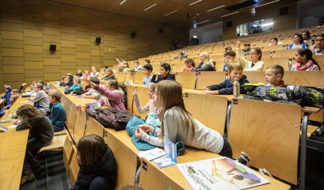 In begleitenden Workshops werden die Inhalte der Vorlesungen vertieft. So konnten die Kinder im Workshop zur Abschlussvorlesung das Gelernte direkt erproben – etwa mit Knete, Wasser, Öl und Lebensmittelfarbe. Dabei zeigte sich anschaulich, dass nicht das Gewicht allein entscheidend dafür ist, dass Dinge schwimmen, sondern vor allem die Form und Verdrängung.