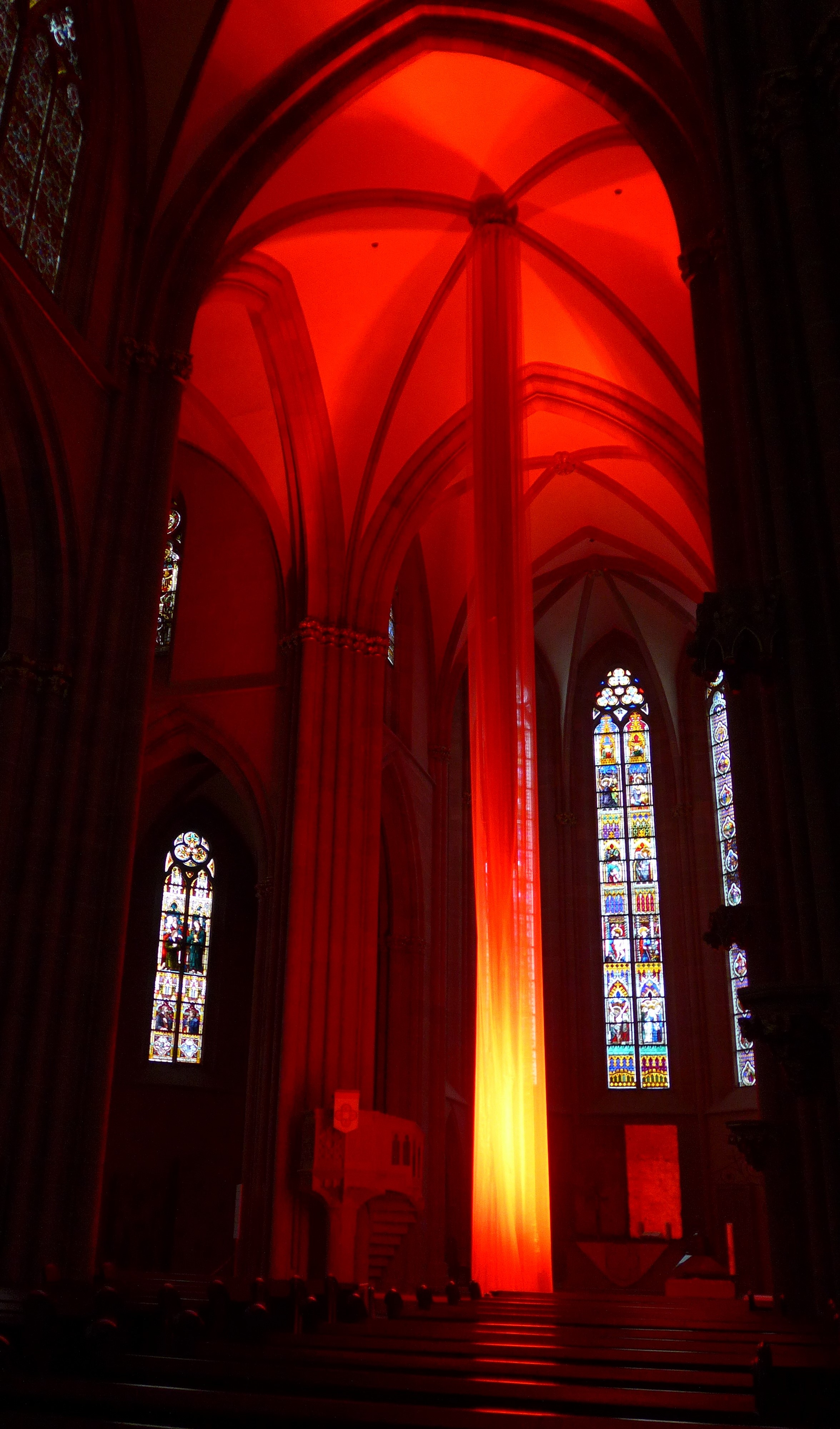 Erklingt am Karfreitag mit der „Geistlichen Musik zur Todesstunde“ noch Passionsmusik für Bariton und Orgel, feiern die Gläubigen in der Osternacht (21. April um 6 Uhr) mit liturgischen Liedern und Gesängen die Auferstehung Jesu. Die „Feuersäule II“ von Marie-Luise Frey leuchtet dann zum ersten Mal in Vierung und Turm und nimmt das Licht der Osterkerze auf. Bis zum 16. Juni, dem Sonntag nach Pfingsten, entfaltet sich ein abwechslungsreiches Veranstaltungsprogramm rund um die „Feuersäule“: Poesie von Katrin Bibiella zu den Steinklängen von Arthur Schneiter, ein Jazzkonzert mit dem Christoph Georgii-Trio, offenes Abendliedersingen, ein Orgelkonzert an Pfingsten mit Professor Hans-Ola Ericsson und eines zum Abschluss der Installation mit dem neuseeländischen Organisten Professor Martin Setchell. Mit dem Festgottesdienst am Trinitatissonntag und anschließendem Fest für alle unter dem Motto „Erleuchte und bewege uns“ enden die Wochen der „Feuersäule“.