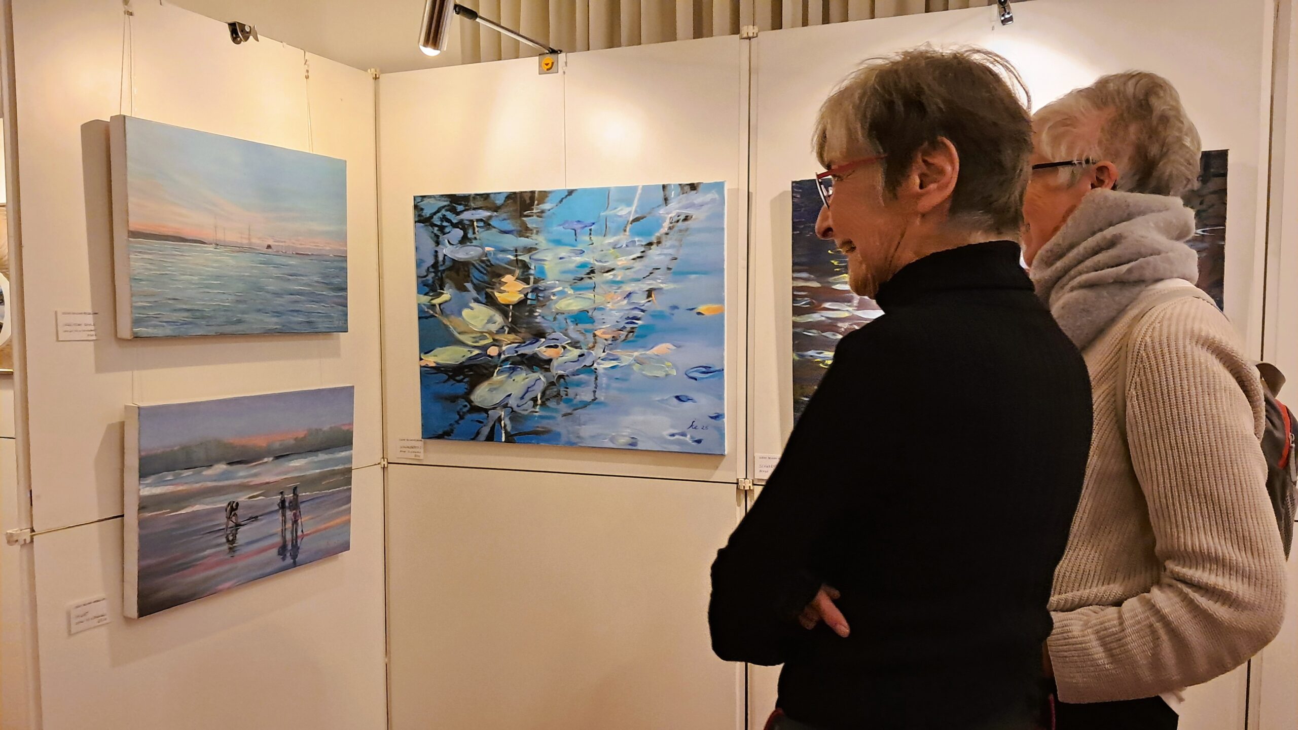 Landschaften in Pastellfarben, farbenprächtige Unterwasserwelten, stille Gewässer, auf denen Licht und Schatten spielen, Akte und Menschendarstellungen, Kalligrafien. Die Besucher drängten sich vor den einzelnen Nischen, in denen die Künstler ihre Werke präsentierten. Die Aktzeichnungen von Mechthild Hubrich sind mit schnellem Strich entworfene und auf das Wesentliche reduzierte Zeichnungen, ihre in Ton gebrannten Figuren wirken dagegen erst durch die Überbetonung der körperlichen Rundungen. Ulrike Delcker-Heidbüchel findet ihre Bildmotive auf Reisen, die sie fotografisch festhält und später im Atelier in Gemälde umsetzt. In ihren ausgestellten Wasserbildern spielt sie gekonnt mit Lichteffekten. Auch Claudia Eckstein-Strehlow hat das Thema Wasser aufgegriffen und auf fast schwarzem Grund eine farbige, korallenähnliche Tiefsee-Flora und Fauna als Triptychon geschaffen, das den Betrachter magisch anzieht.