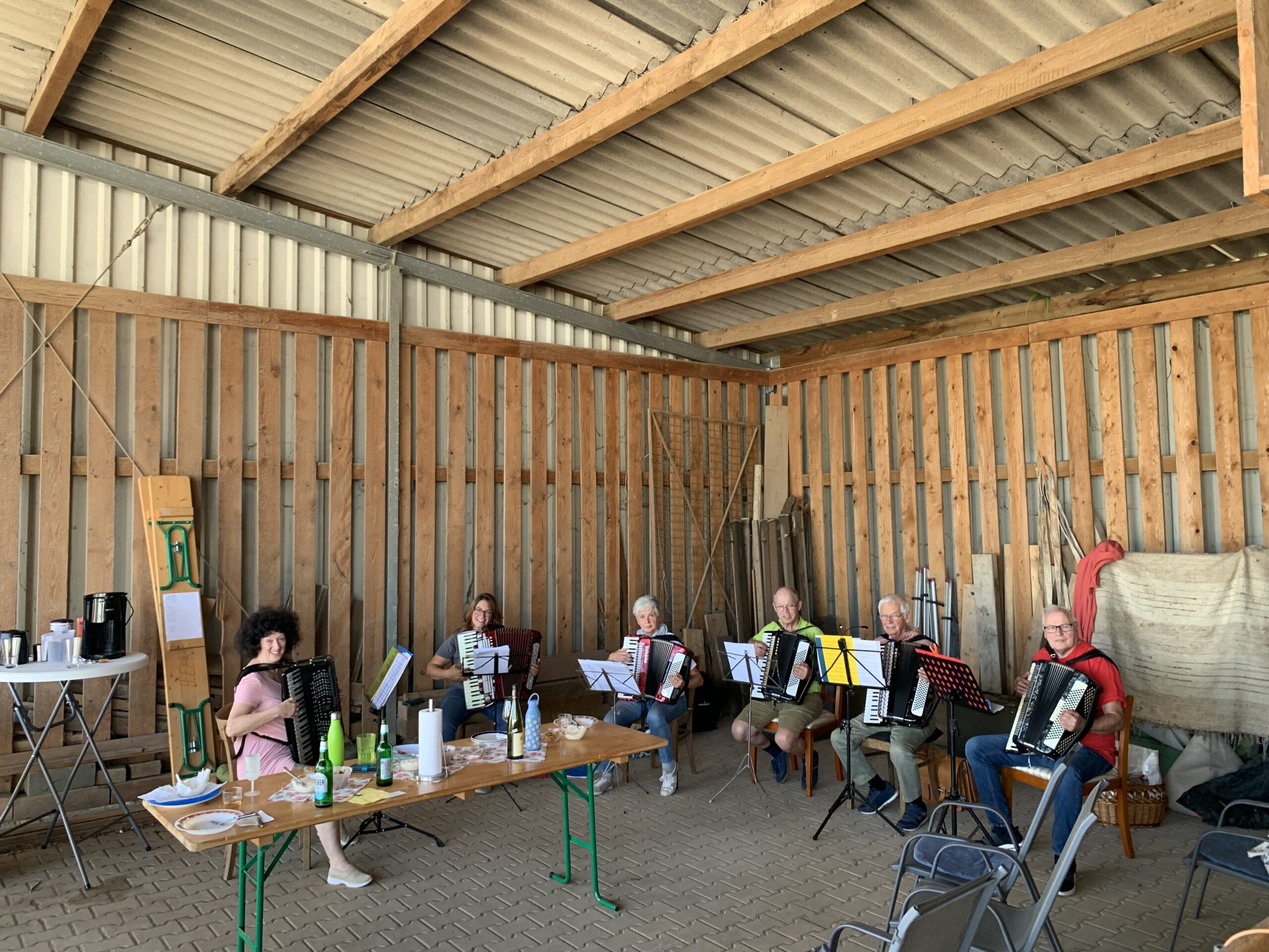 GONSENHEIM – Wo früher Hermann Eck als Gemüsebauer seine Felder bestellte, traf sich vor kurzem eine Gruppe von sechs begeisterten Akkordeonspielerinnen und Akkordeonspielern zu einem gemütlichen Beisammensein an einem sonnigen Tag. Ganz ohne Publikum, Bühne oder Scheinwerfer wurde zusammen musiziert, gelacht und das Leben gefeiert – tief verbunden durch die Leidenschaft für ein außergewöhnliches Musikinstrument.