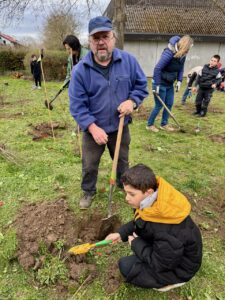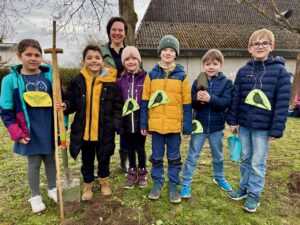 Heidi Veit-Gönner, Umweltbeigeordnete der Ortsgemeinde Bodenheim, packte nicht nur symbolisch mit an, sondern griff tatsächlich zum Spaten. „Wenn die Gemeinde schon Eigentümerin des Grundstücks ist, dann wollen wir auch mit anpacken“, erklärte sie lachend, während sie gemeinsam mit den Kindern ein Pflanzloch aushob. Für sie ist auch ein Ziel, die Grünfläche durch die Bepflanzung deutlich von den Parkplätzen abzugrenzen, denn: „Manche Bürger parken hier tatsächlich auf dem Grün.“