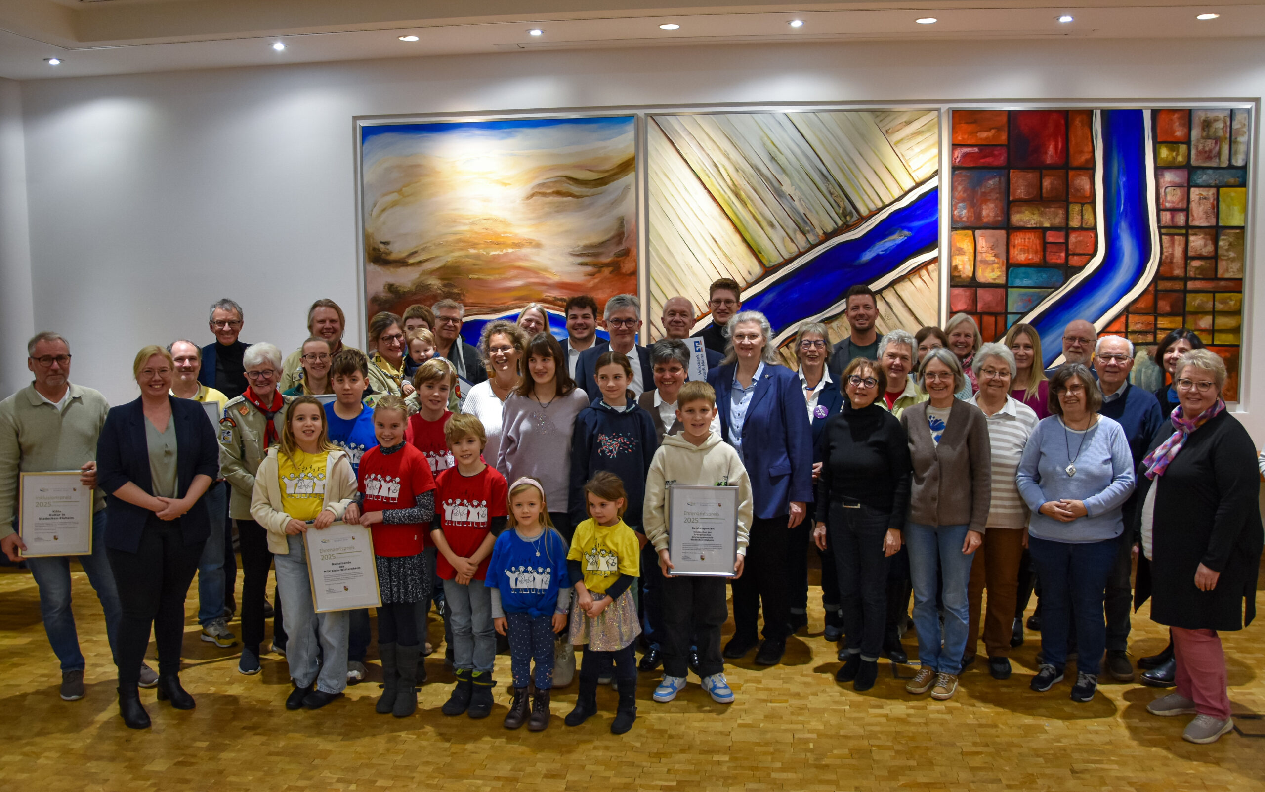 Die Laudationen auf die sieben Preisträger, die mit außergewöhnlichem Engagement das Leben in der Verbandsgemeinde bereichern, hielt Bürgermeister Ralph Spiegler persönlich. So wurden an diesem Abend folgende Vereine und Initiativen ausgezeichnet: Den Ehrenamtspreise 2025 erhielten die „Rasselbande“ des MGV Klein-Winternheim (vier Chorgruppen mit bis zu 150 Kindern), die Jugendgruppe des Deutschen Roten Kreuzes Nieder-Olm, die „Selztalspatzen“ (Kinderchor der Evangelischen Kirchengemeinde Stadecken-Elsheim) und der Musikverein Klein-Winternheim.