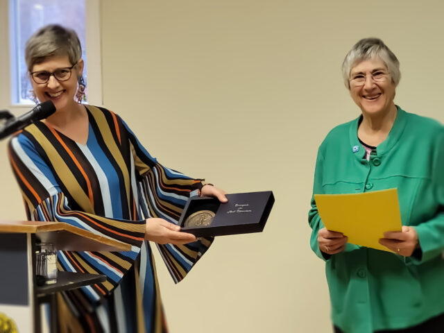 Nach einer kurzen musikalischen Pause durch das Oppenheimer Saxophonquartett standen zwei Ehrungen auf dem Programm: zum einen der Dank für das jahrelange Engagement von „Obermaulwurf“ Armin Eggebrecht um die Erforschung und Pflege der Burgruine Landskron, zum anderen die Ehrung von Johanna Stein für ihren Einsatz zur Gedenk- und Erinnerungskultur gegen die Verbrechen der NS-Herrschaft in Oppenheim. Mit ihren Projekten „Gewalt hat eine Geschichte“ oder „Dem Vergessen entgegentreten“ spielt sie eine immer wichtigere Rolle auch im politischen Geschehen der Gegenwart, oder wie es ihr Laudator Hans-Peter Hexemer, Träger des Bundesverdienstkreuzes aus Nierstein, treffend ausdrückte: „Johanna Stein ist im besten Sinne eine Oma gegen Rechts“.