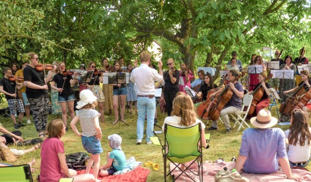 BRETZENHEIM – Sommer, Sonne, SinfOrMa: All dies genossen die zahlreichen Besucher und Besucherinnen am Wochenende im Naturschaugarten Lindenmühle. Bei Temperaturen um 30 Grad Celsius machten es sich die Gäste auf mitgebrachten Picknickdecken und Campingstühlen in idyllischer Atmosphäre gemütlich, um dem Konzert des sinfonischen Orchesters Mainz zu lauschen. Im Rahmen ihres neuen Projektes, einer „musikalischen Reise durch die Natur“, gab das Orchester im Naturschaugarten am Mühlweg eine abwechslungsreiche und kostenfreie Musikaufführung zum Besten.