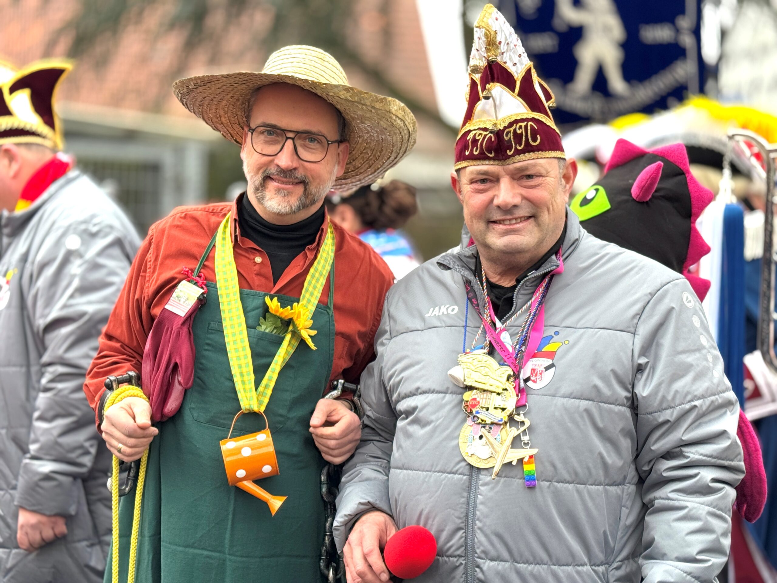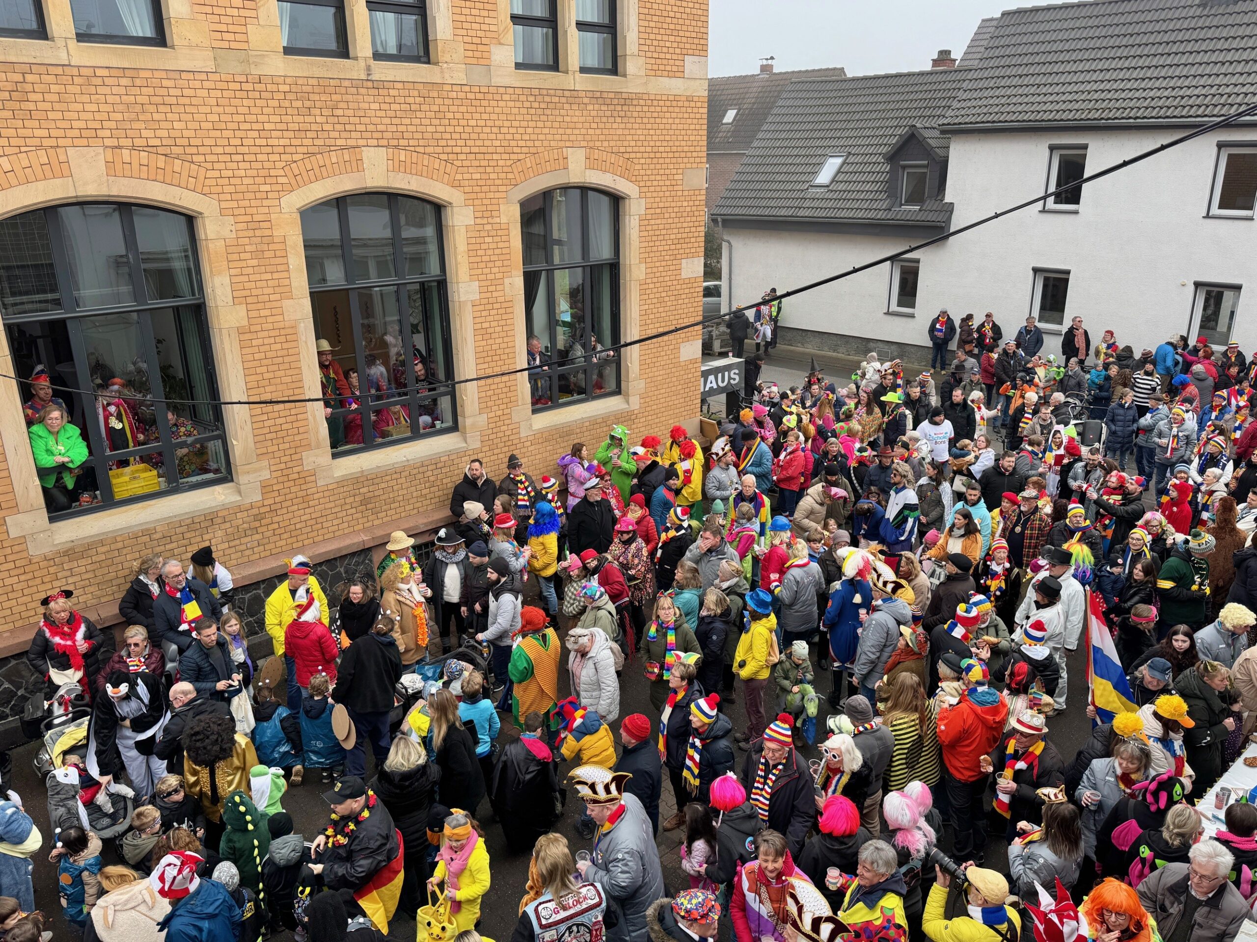 Begonnen hatte das bunte Treiben um 10.33 Uhr im Hof des Rathauses. Die Guggemusik „Rhoirevoluzzer Mainz“ sorgte für einen musikalischen Auftakt, während sich der Narrenzug vom Altrheinufer aus in Richtung Rathaus bewegte. Dort lieferten sich Klaus Rüdiger, Sitzungspräsident des TTC Ginsheim, und der Bürgermeister einen humorvollen Schlagabtausch. Für die Verteidiger*innen des Rathauses – darunter Vertreter*innen der Lokalpolitik, Bundes- und Landtagsabgeordnete, der Landrat sowie Mitarbeitende der Verwaltung – gab es jedoch kein Entrinnen: Die Kita-Kinder stürmten das Rathaus, legten Bürgermeister Thorsten Siehr in Fesseln und übernahmen symbolisch die Macht.
