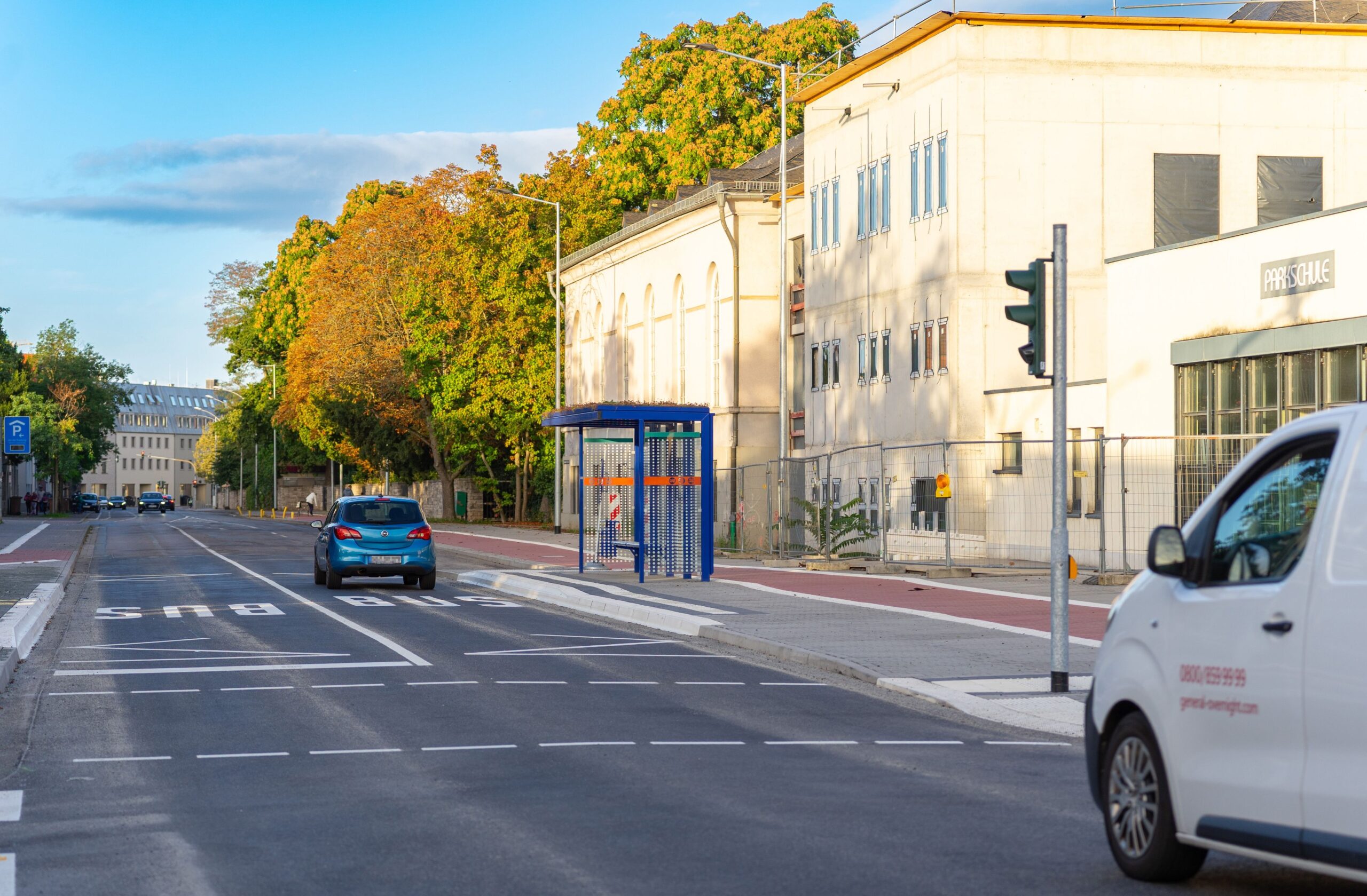 Für den barrierefreien Ausbau wurde unter anderem das Niveau der Wartebereiche erhöht. Zudem wurden für Menschen mit Sehbeeinträchtigungen taktile Elemente im Haltestellenbereich eingebaut, die sie mit ihrem Stock ertasten können, um den Weg zur und von der Haltestelle zu finden. Die Bushaltestellen haben auch neue Wartehäuschen erhalten, die als eine Maßnahme zur Klimaanpassung mit einer Dachbegrünung bestückt wurden. Die begrünten Dächer bieten künftig Insekten Lebensraum und leisten einen Beitrag dazu, das Stadtklima zu verbessern. „Um die Mobilität nachhaltig voranzubringen, nutzt die Stadt bei Baustellen Förderprogramme und Synergieeffekte. Diesen Weg werden wir gerade angesichts klammer Kassen weitergehen“, sagt Stadtrat Simon Valerius.