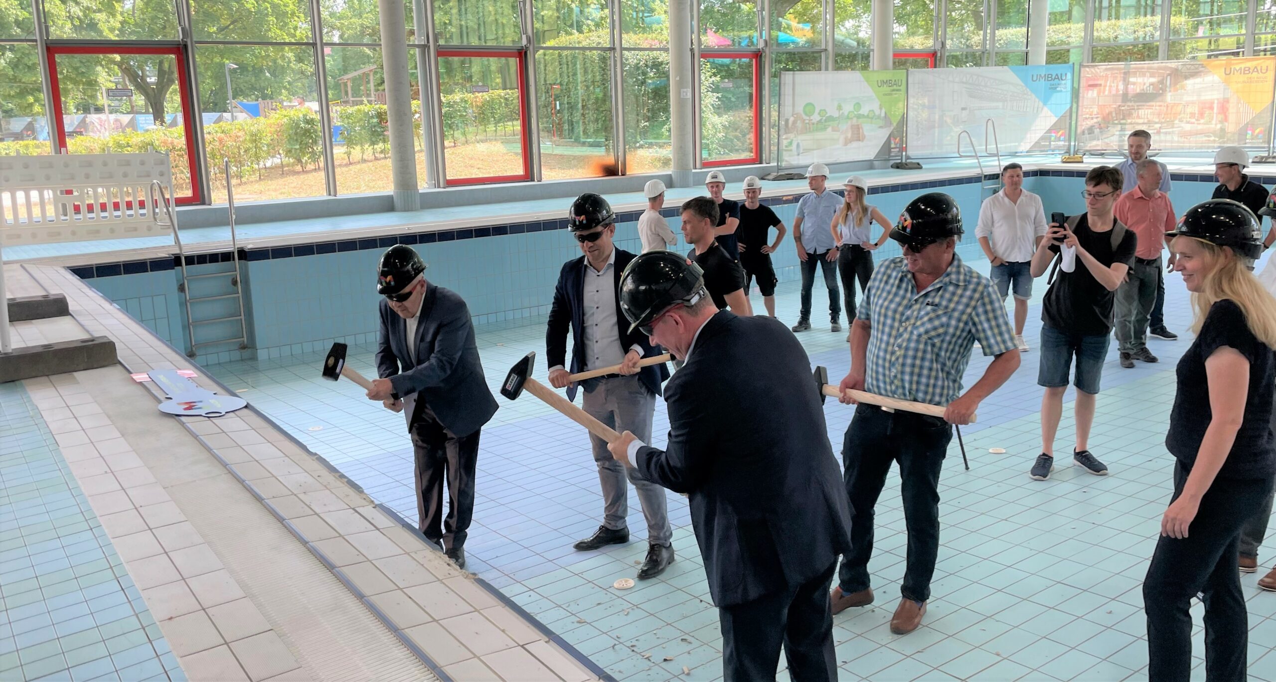 MAINZ – Wenige Wochen nach der Eröffnung der Freibadsaison 2023 sind am Taubertsbergbad bereits die Bauarbeiter am Werk: Die Modernisierung und der Umbau des früheren Sport- und Erlebnisbadbereichs zu einem Familienbad und einem großzügigen Wellness- und Saunabereich ist heute mit einer symbolischen Schlüsselübergabe gestartet. Der Stadtwerke-Vorstandsvorsitzende Daniel Gahr und die Geschäftsführerin der Mainzer Stadtbad GmbH, Kerstin Stumpf, übergaben im Nicht-Schwimmerbecken des Sportbades zusammen mit Oberbürgermeister Nino Haase und Sportdezernent Günter Beck einen überdimensionalen Schlüssel an das ausführende Generalunternehmen Karrié und den Projektsteuerer Roland Brand-Hofmeister von der ÜWG Engineering GmbH. Der Schlüssel ist eine Art „Leihgabe“ an die Bauausführenden und soll nach dem Abschluss der Arbeiten Ende