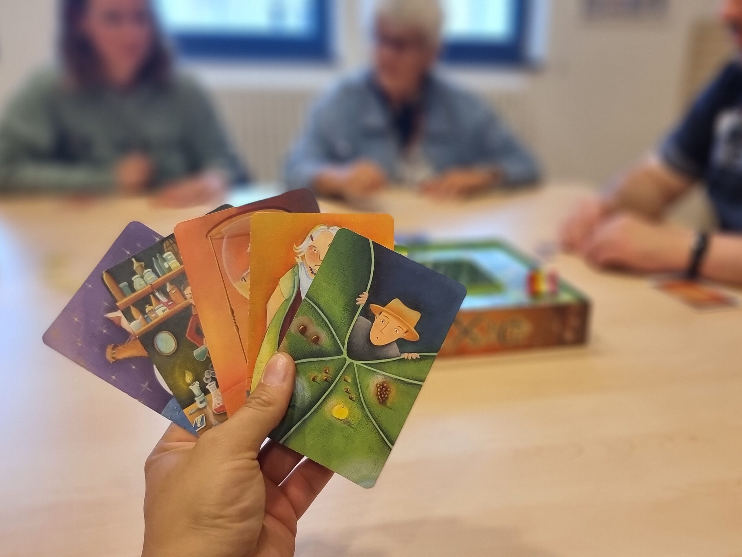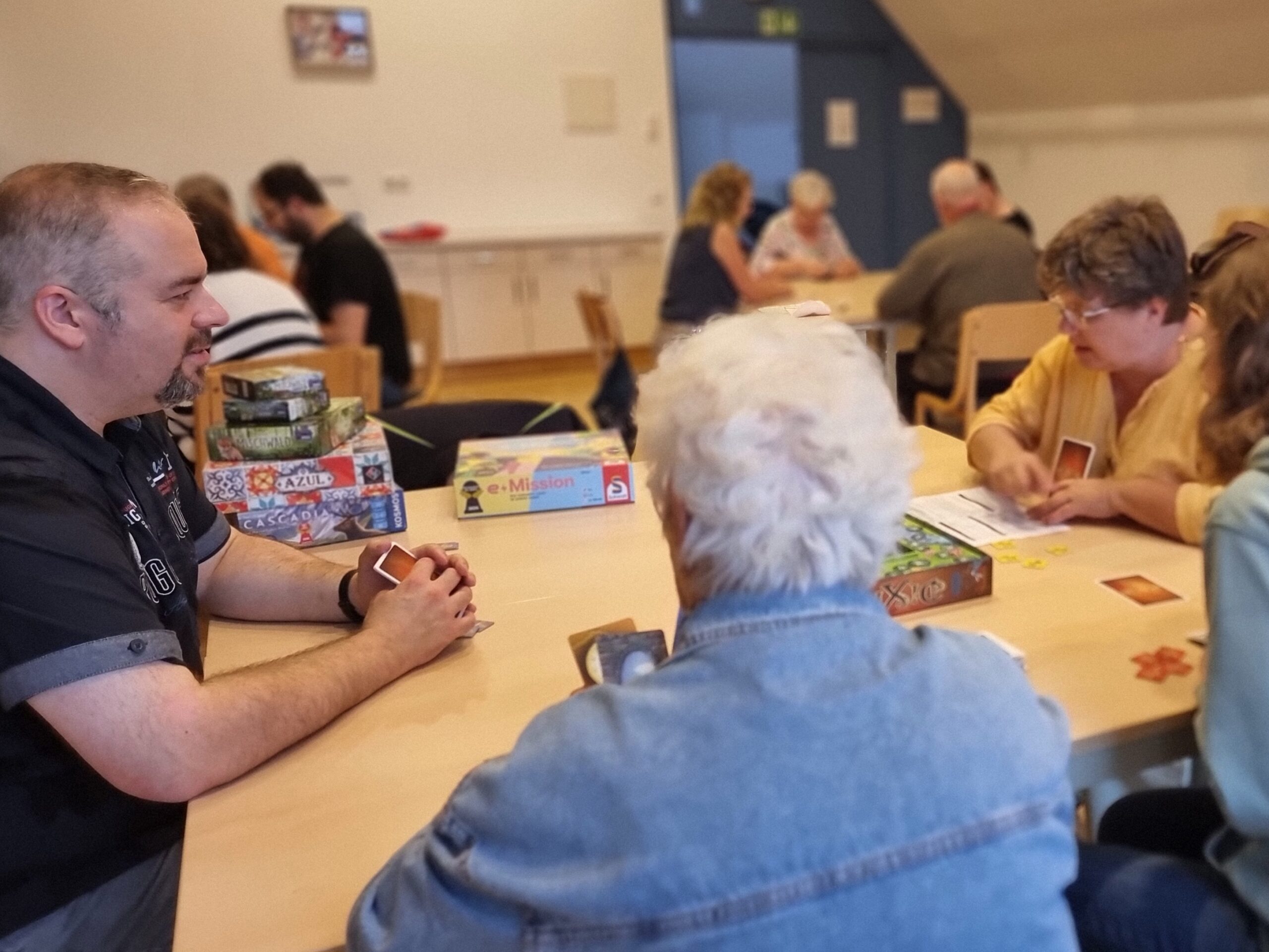 LÖRZWEILER – Das Spielen verbindet die Menschen seit jeher: ob in Stein geritzt in der Urzeit, auf Papier gedruckt oder gewürfelt. Das tun auch die Gesellschaftsspiele – darüber hinaus schaffen sie Gemeinschaft, fordern den Verstand und machen vor allem Spaß. Erlebt haben das vor Kurzem 16 Spielerinnen und Spieler in Lörzweiler beim Spieletreff für Erwachsene im September. Auf die Tische im Gemeindesaal kamen die Spiele, die die Teilnehmer mitgebracht hatten.
