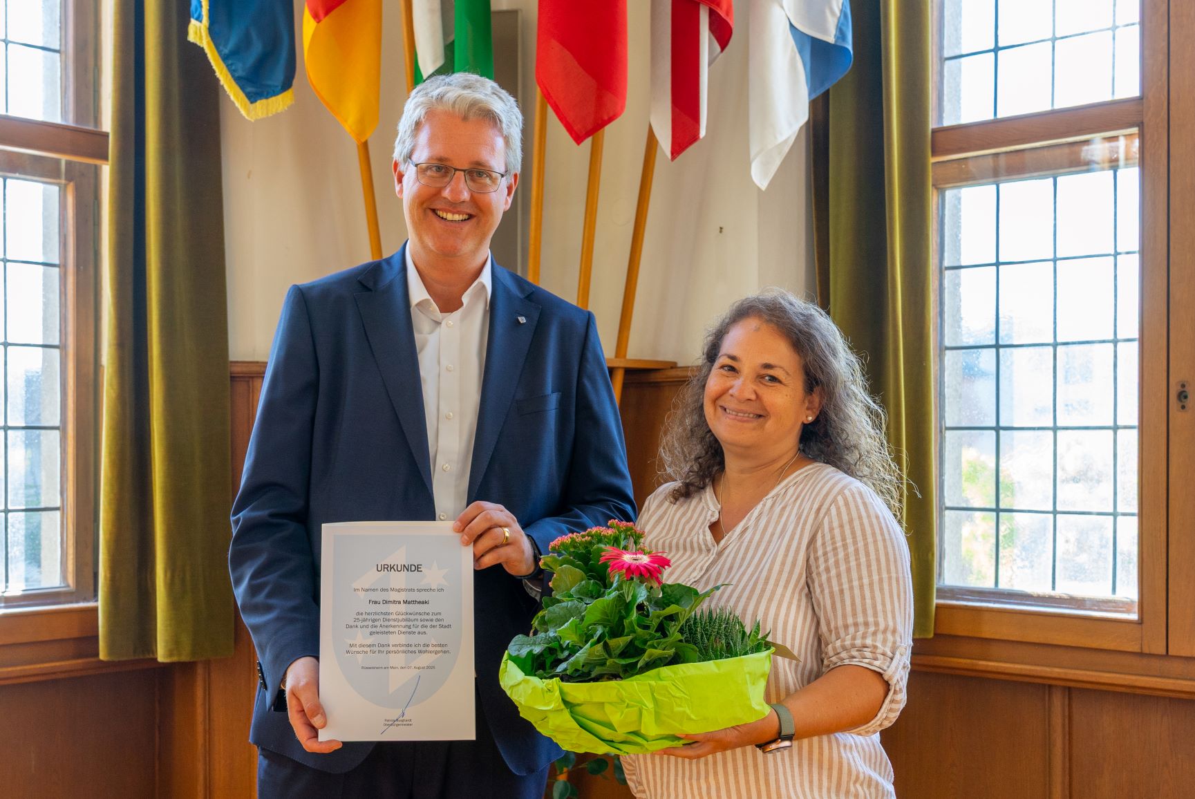 RÜSSELSHEIM – Im Namen des Magistrates der Stadt Rüsselsheim am Main gratulierte Oberbürgermeister Patrick Burghardt Dimitra Mattheaki zu ihrem 25-jährigen Dienstjubiläum. Dimitra Mattheaki besuchte die Grund-, Real- und höhere Handelsschule in Rüsselsheim am Main. Im Jahr 1997 begann sie ihre Ausbildung zur Erzieherin und wurde 2001 nach erfolgreichem Abschluss als Erzieherin in der Kita Zamenhoferstraße übernommen. Seit 2010 ist sie in der Kita Liebigstraße als stellvertretende Leitung tätig.