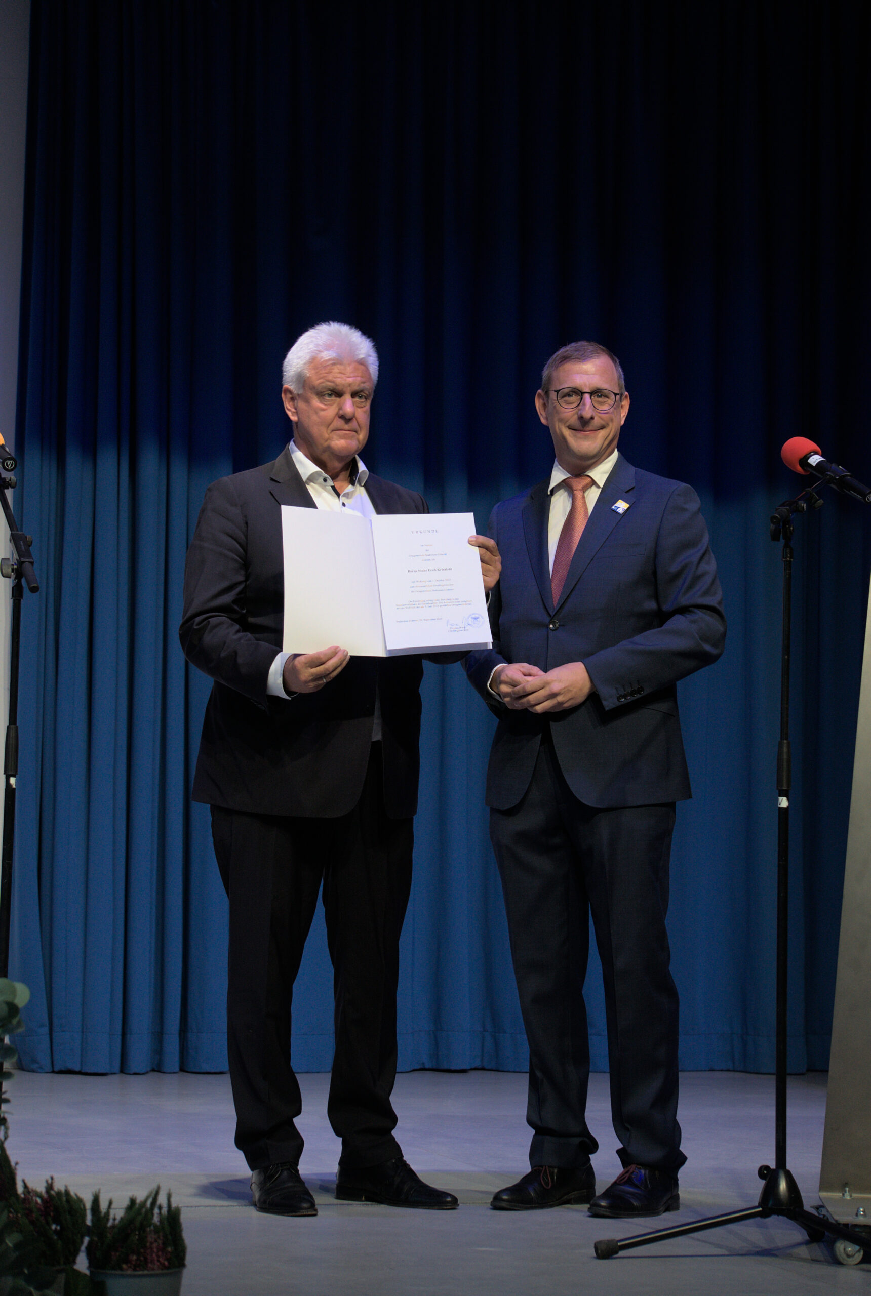 Im Anschluss an diese Sondersitzungen waren die Bürgerinnen und Bürger dann zu einer akademischen Feier eingeladen. Dort wurde Thomas Barth in festlicher Atmosphäre verabschiedet, es wurden Dankesworte ausgetauscht sowie Anerkennung ausgesprochen. Die Verbandsgemeindeverwaltung Nieder-Olm bedankt sich bei Thomas Barth für das vertrauensvolle Miteinander und wünscht ihm einen erfolgreichen Beginn als Landrat des Landkreises Mainz-Bingen. Gleichzeitig begrüßt die VG-Verwaltung Herrn Krützfeld offiziell im Amt und wünscht ihm viel Erfolg sowie einen reibungslosen Start.